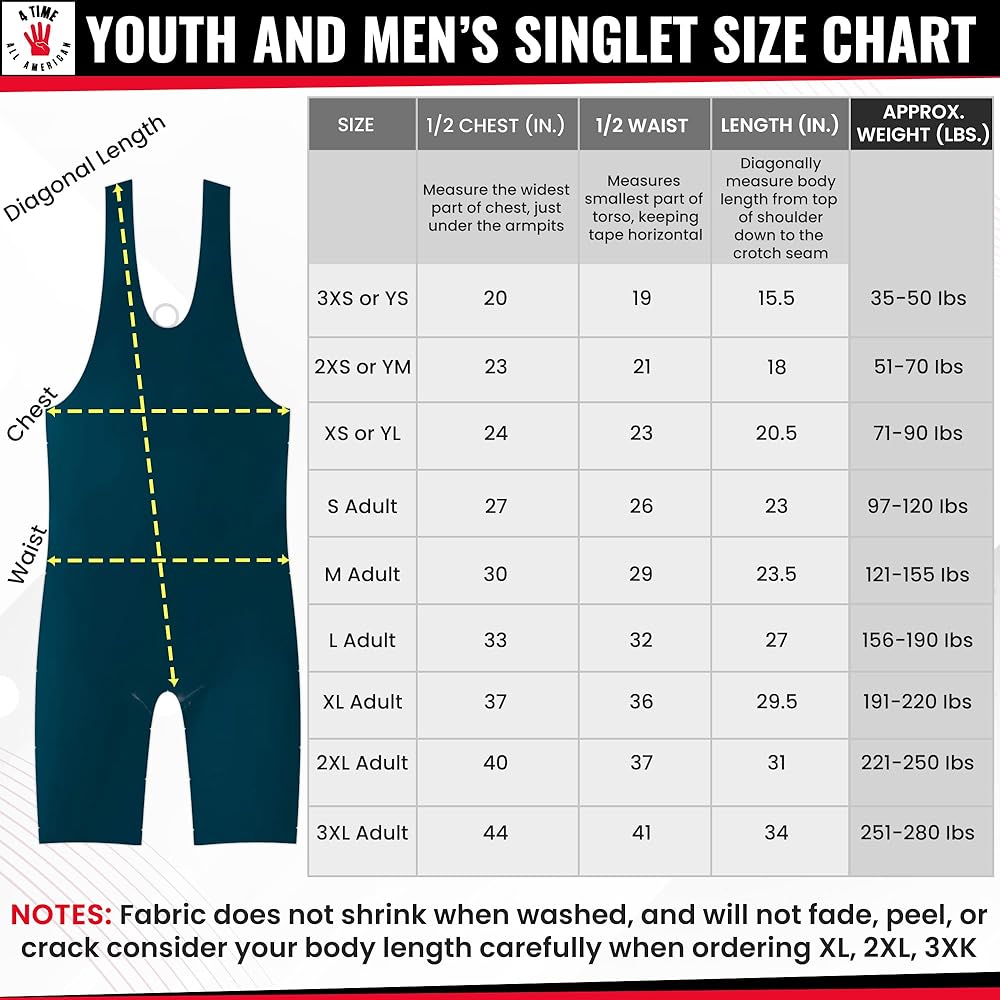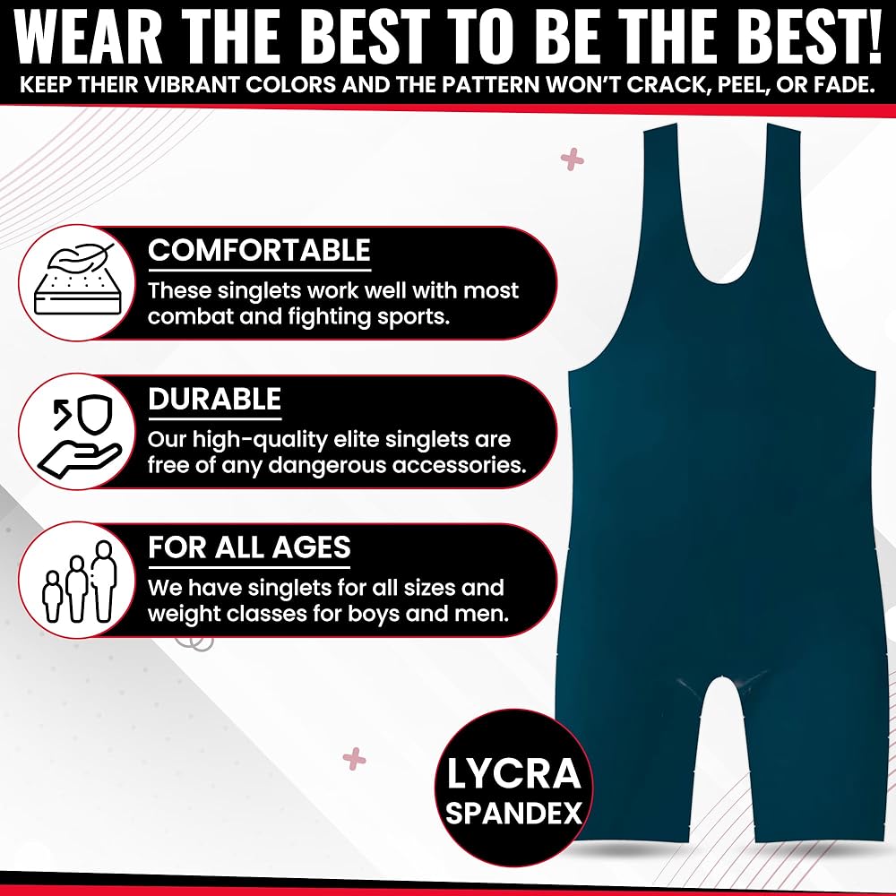 COMFORT FOR ALL AGES: Our high-quality elite singlets are free of any dangerous accessories that can be found on some wrestling shorts and other clothing. We have singlets for all sizes and weight classes for boys and men. Our soft, moisture-wicking technology singlets can be purchased in large and small kid and adult sizes: 4XS–5XL.
