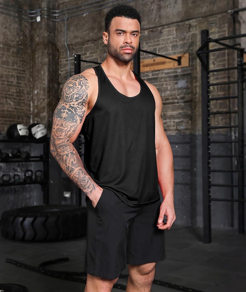 Y-BACK DESIGN - Tank tops for men are sometimes referred to a T-Back or Racerback. Workout tank tops for men feature with u-type collar, y back, sleeveless and loose large arm holes design allows greater mobility and show off your muscles and tattoos when you doing exercise, running, training.
