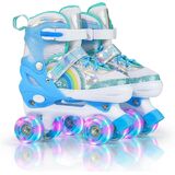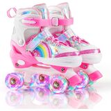 🌈【4 Size Adjustable Roller Skates】-Our roller skates can be adjusted to 4 different sizes to fit different foot lengths. 2 sizes are available: Small-Little Kid/Medium-Big Kid. Easy and convenient one button to adjust the size, find the exact fit! It is a perfect choice for growing children.