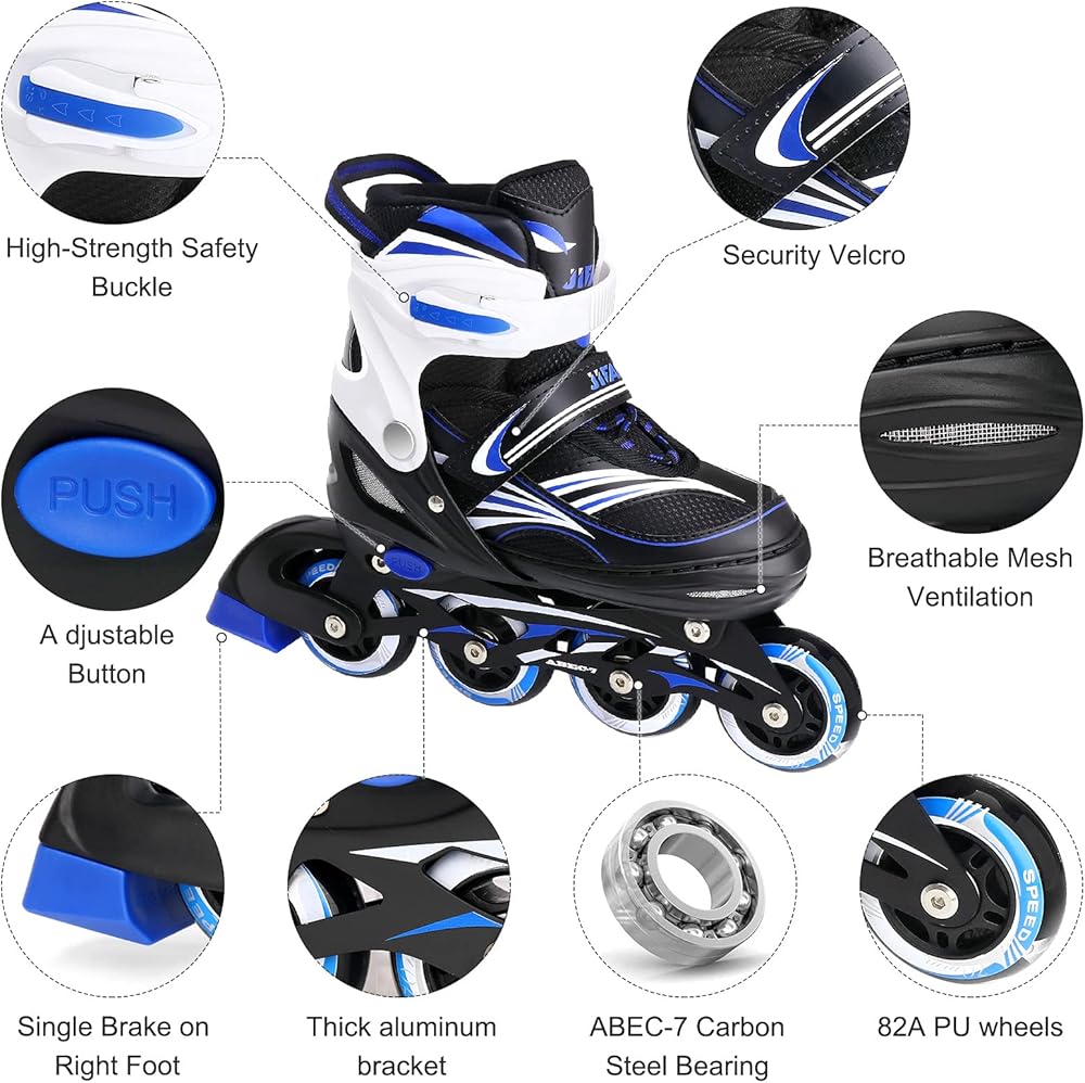 💗1. 【Adjust size】:Our inline skates have 2 different Unisex size(Small -12J-2 US and Medium -2-5 US) please make sure to choose the correct size via checking enclosed size chart pictures . And do not forget to adjust the length of boot by the push button before wearing, you will find that it's so convenient to operate, and kids and youth can use it for many years even though their feet are growing up.
