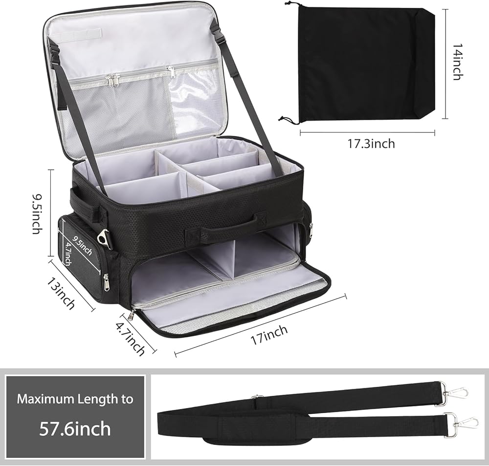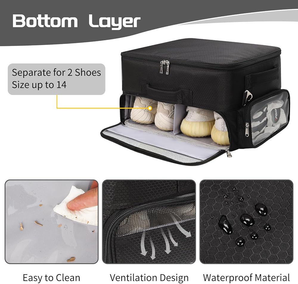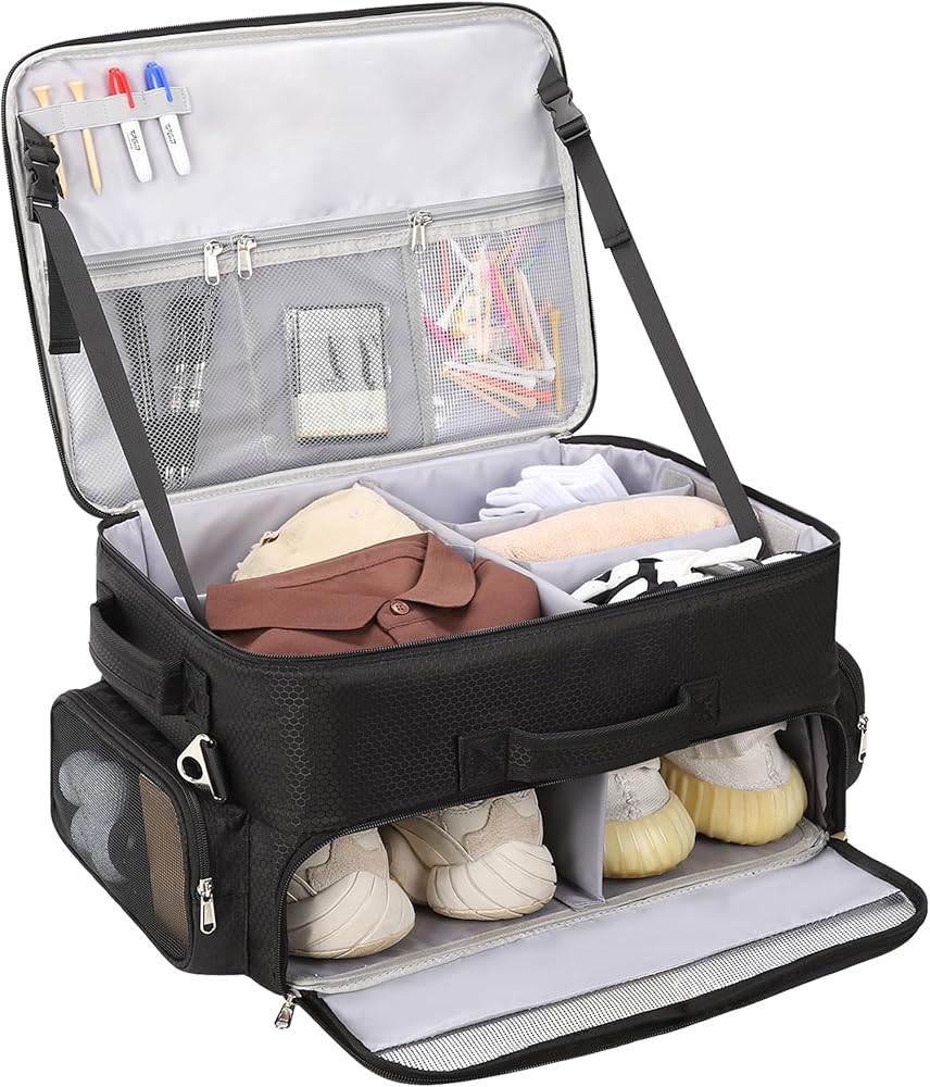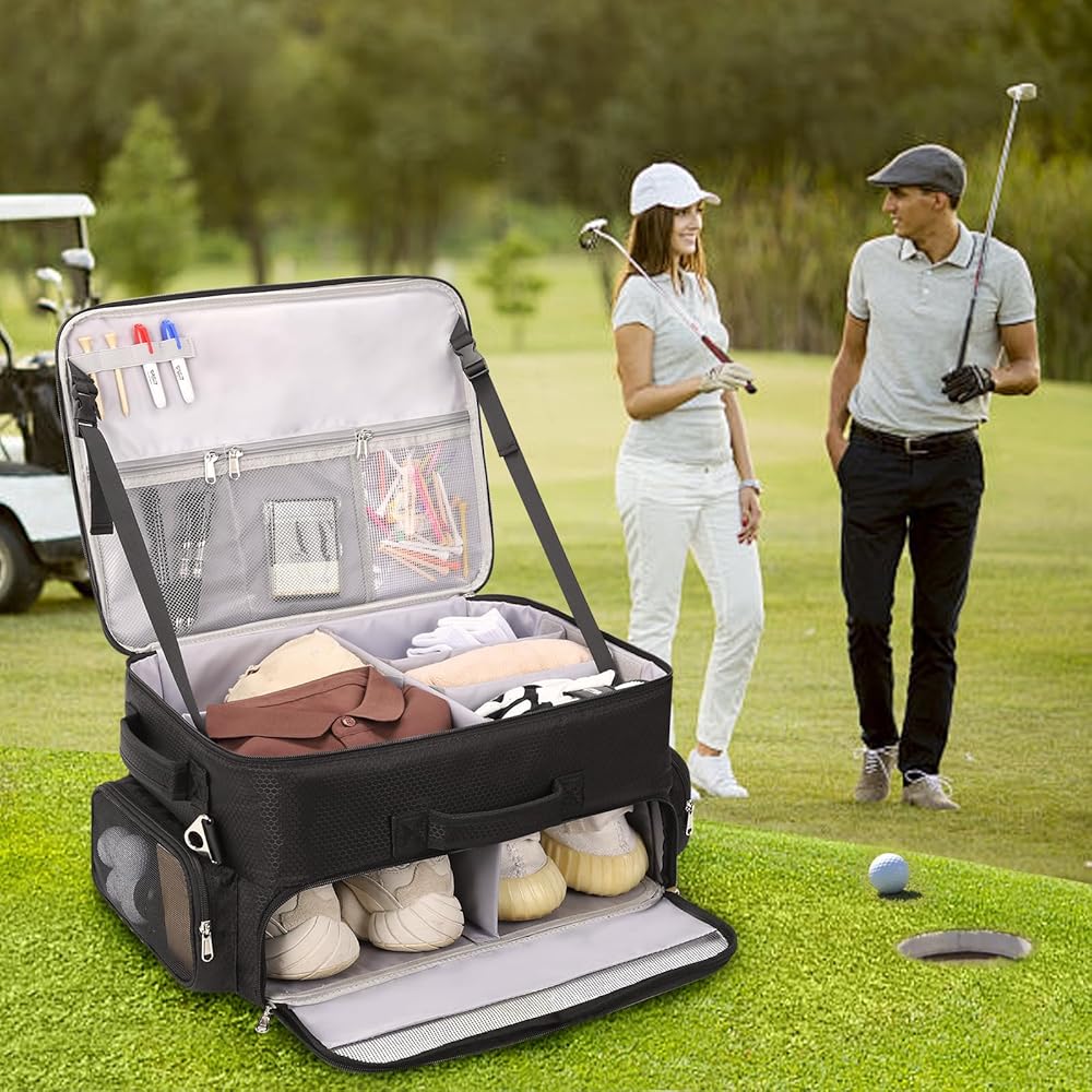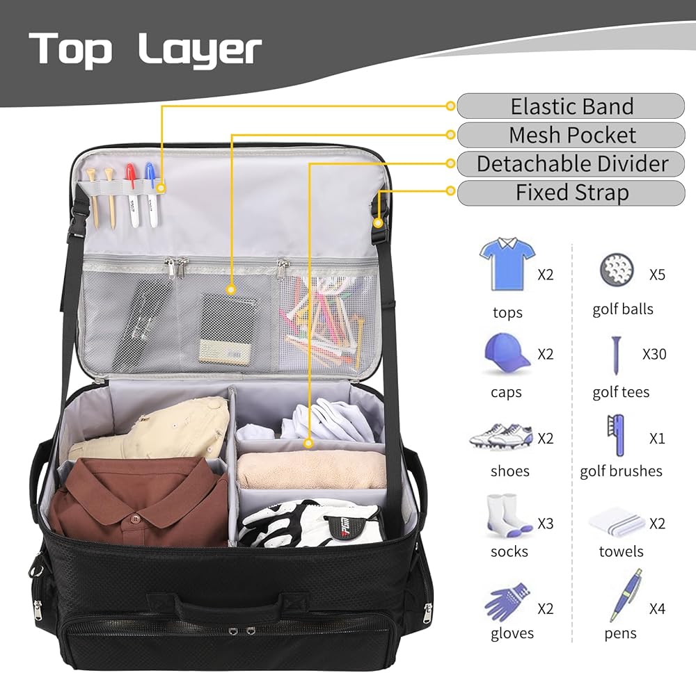 ⛳【Double Layer Separate Storage】The Top layer use to keep golf accessories together, such as golf balls, golf tees, golf brushes, scorecards, gloves, socks, towels, shirts, caps, et. The bottom layer, to store 2 pairs of shoes up to size 14, mesh ventilated holes keep air flowing around shoes, easy to clean with great lining cloth.