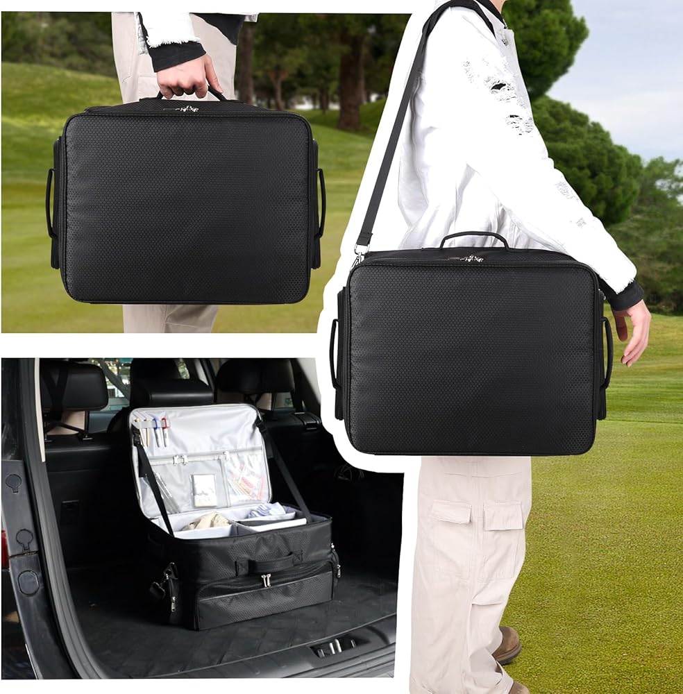 ⛳【Easy to Carry】The golf car trunk locker with a adjustable single shoulder strap, easy to take all golf essentials in your vehicle, Front and there are handles on both sides for hauling in and out of the car. ID card holder on the side, your own golf bag.