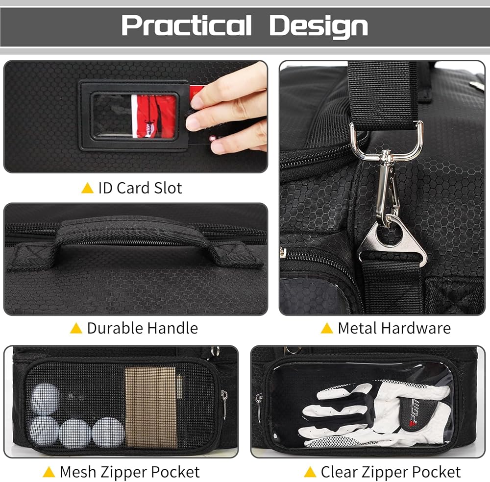 ⛳【Large Capacity 】The golf organizer bag has 5 storage sections, used to keep golf accessories together, such as golf balls, golf tees, golf brushes, scorecards, gloves, socks, shoes(up to size 14), towels, shirts, caps, etc. Side zippered clear pocket and zippered mesh pocket, can store many golf essentials! It also allows storing other needed things for travel or other outdoor activities.
