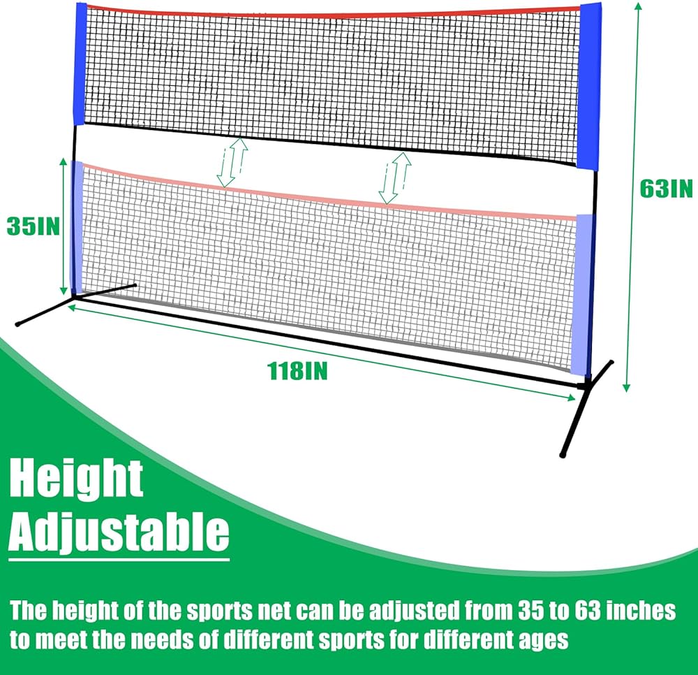 🎾TENNIS NET FOR BACKYARD -- OKAYES tennis net with the width 118in and the height 35-63in, is very suitable for use in the backyard. This potable tennis net for driveway makes it possible for you to enjoy the sport without going to the court. Simple installation and removal and tote bag storage make this tennis net not take up too much space when not in use.