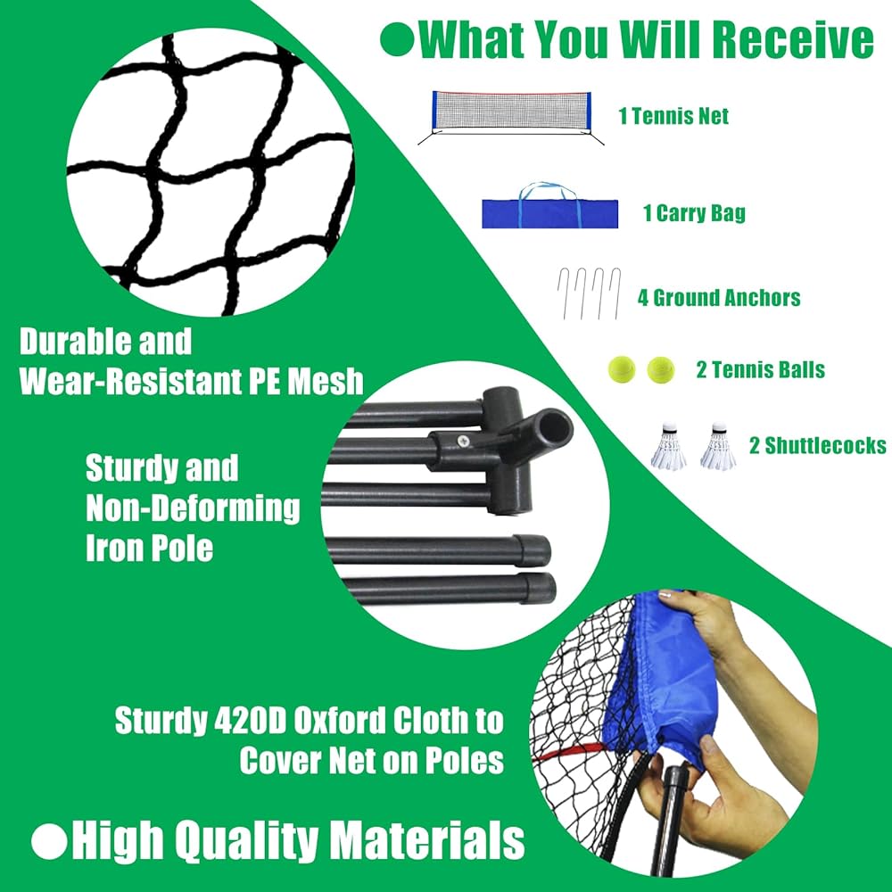 🎾QUALITY MATERIAL & SERVICE -- The main materials of this tennis net for backyard are PE mesh and painted iron poles, which are strong, durable and rust-proof in normal use. We hope to provide customers with 100% perfect products and services, and are working hard to achieve this. So if you have any problems with our products, please feel free to contact us!