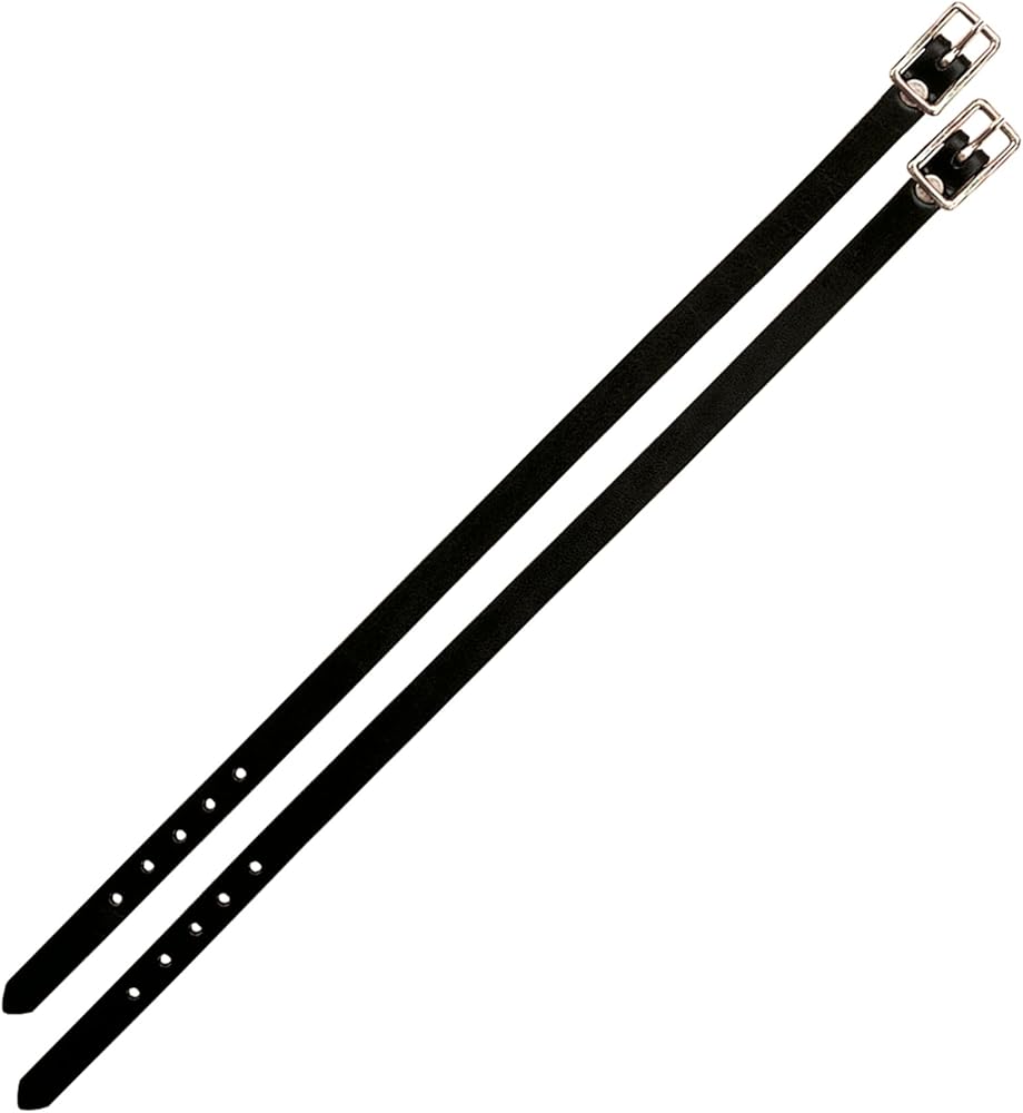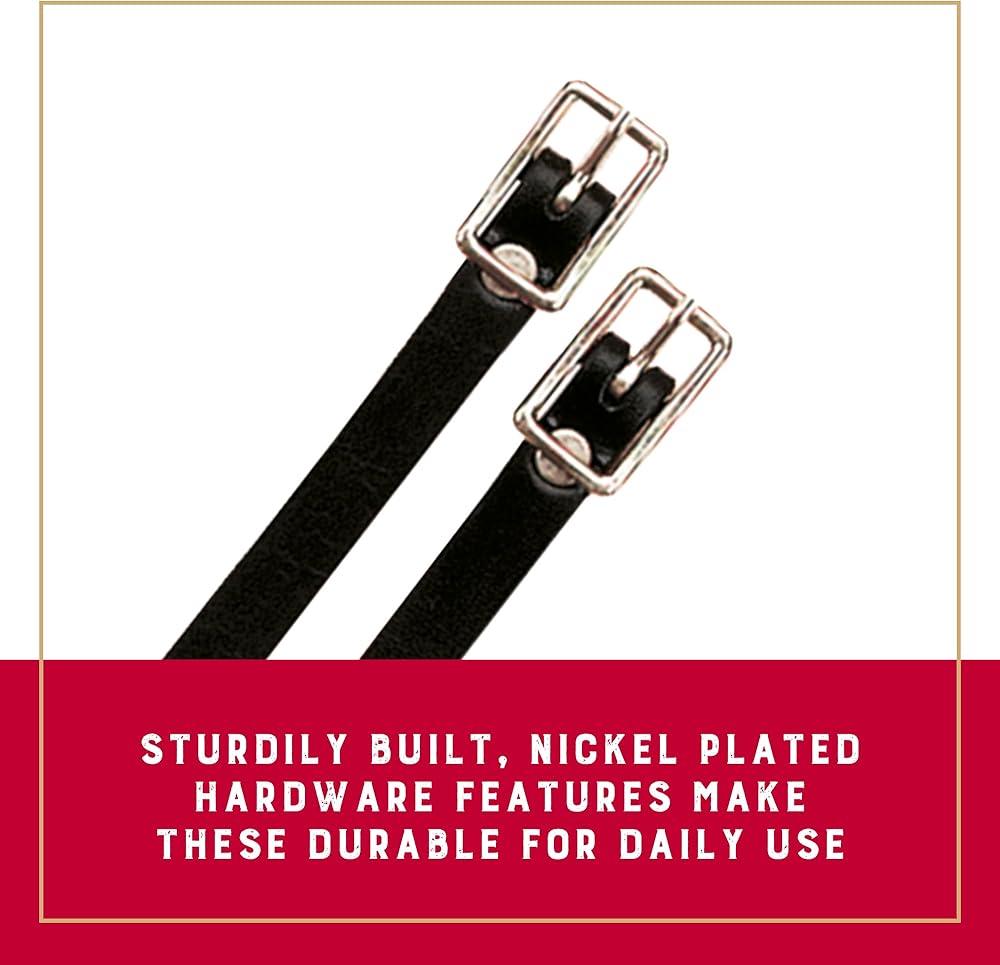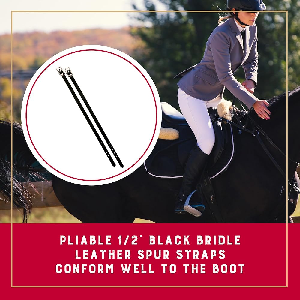These pliable 1/2" black bridle leather spur straps conform well to the boot and feature smoothed, darkened edges and nickel plated hardware. Sold per pair.