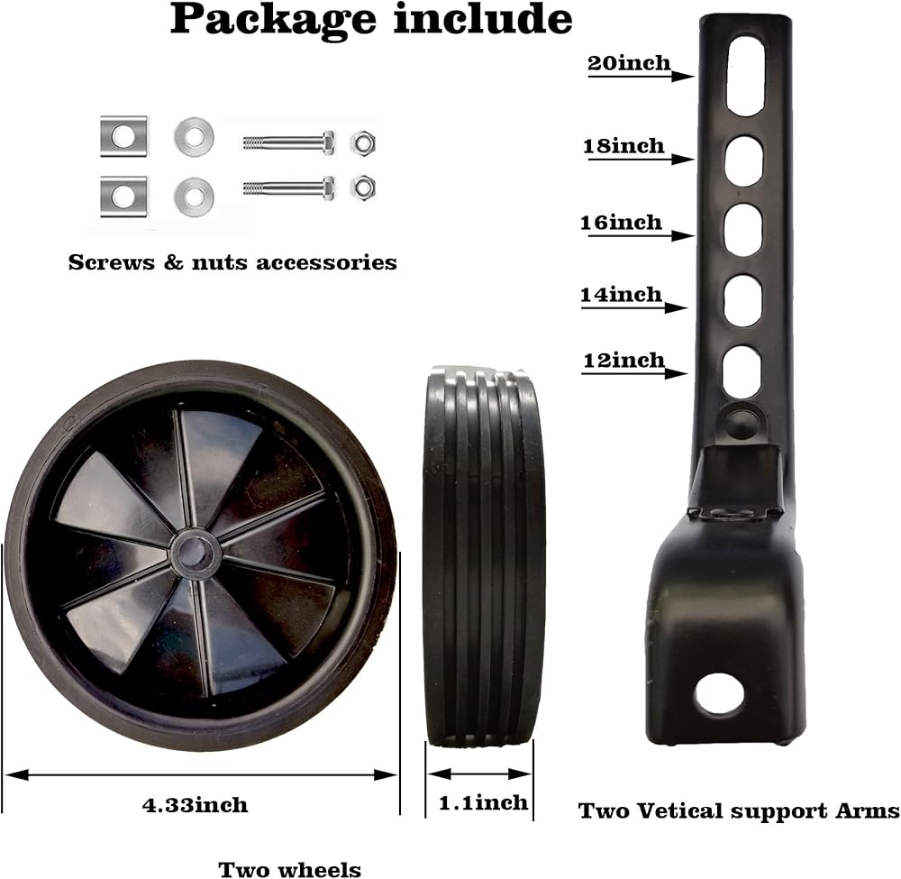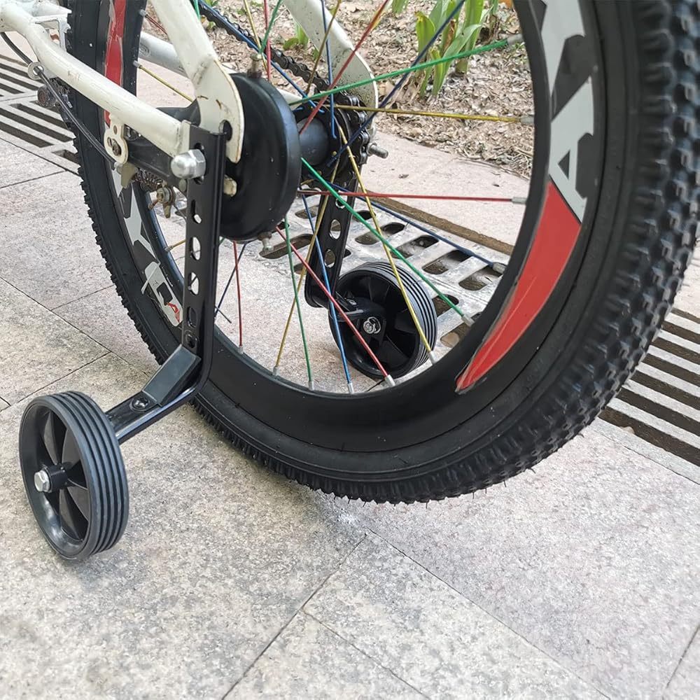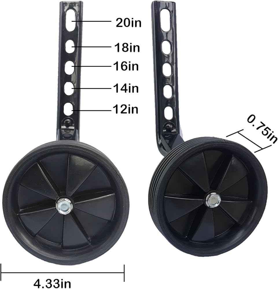 Adjustable bicycle training wheels: The training wheels with stabilizer is adjustable, which can be adjusted to fit various children's bikes with 12-20 inch wheels.