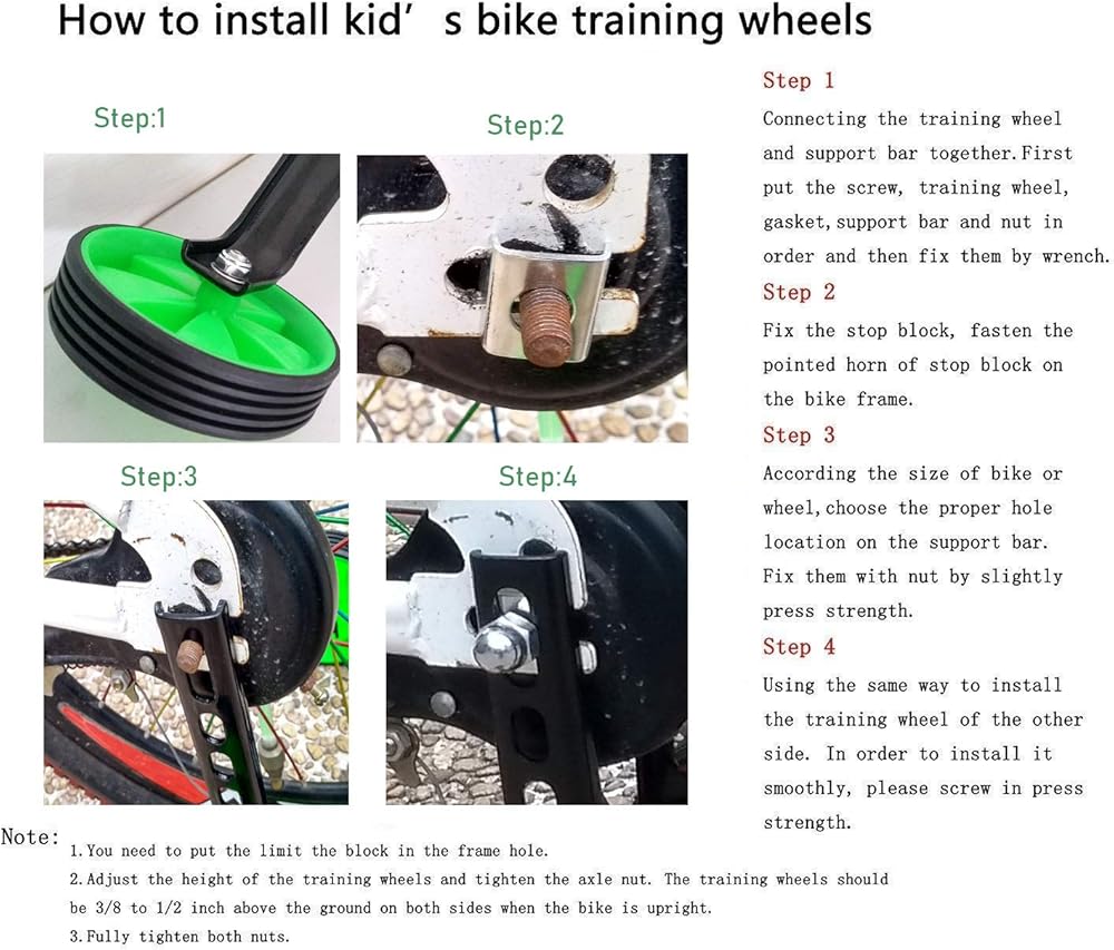 Enhance confidence and independence: By using these training wheels, children can gain confidence and independence in their biking skills. The stability provided by the training wheels allows kids to learn at their own pace and gradually build their riding skills. As they become more comfortable, the training wheels can be gradually raised or removed to transition to riding without assistance.