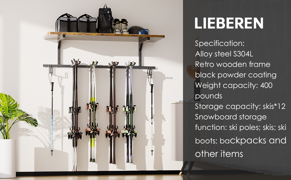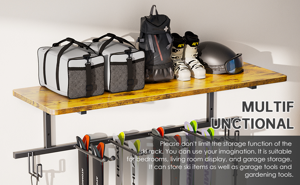 Snowboard Wall Mount Has Many Uses:ski rack for garage wall Holds Racing skis, Powder skis, Twin Tip skis, All Mountain skis, Downhill skis, Slalom skis, Cross Country skis, and Kids skis, and most skis. Skis should be banded together for efficient storage. Multi-purpose hooks allow you to store both the poles and skis at the same time.The large shelf on the top can store skates, ski boots, storage boxes etc,perfect home organization.