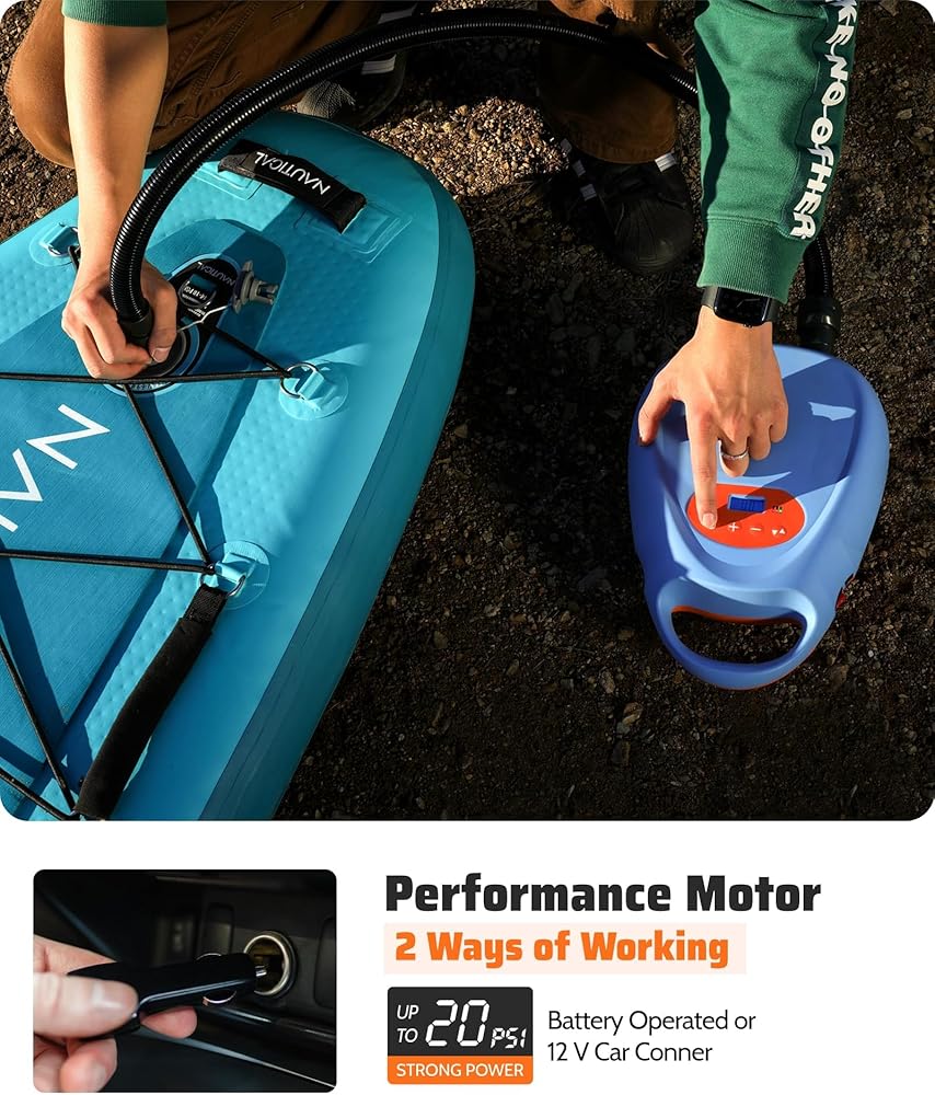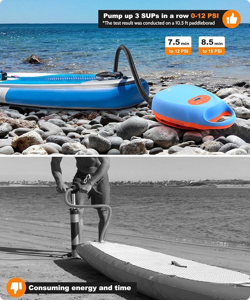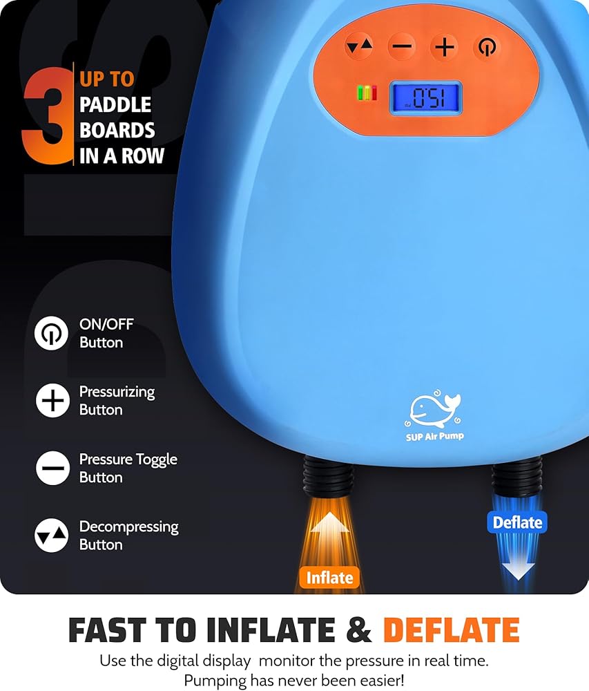 FAST & POWERFUL DUAL STAGE INFLATION & ATUO OFF: Maximum speed of 350 l/min for the first stage and maximum pressure of 70 l/min for the second stage. For a 10.5FT SUP, it can reach 15PSI in just 8 minutes and 12PSI in 7 minutes.Automatic shutdown when pressure monitoring reaches preset value (manual shutdown required for deflation).