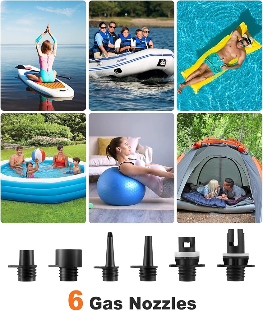 WIDE RANGE OF USE:This SUP air pump comes with 6 different nozzles for paddleboards, inflatable kayaks/boats, yoga balls, inflatable tents, swimming pools, inflatable couches, air mattresses and more. Whether you're going camping or on a beach holiday, our pump will be your perfect travel companion.