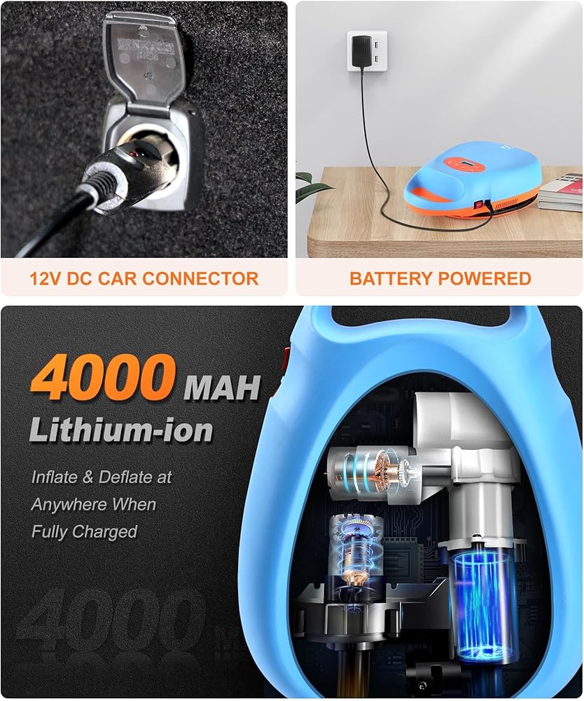 ENJOY YOUR PADDLING EVERYWHERE WITH EASE:FIDISP Paddle Board Pump Built-in 4000mah Battery( with 10 W fast charge, it can be fully charged in 2.5 hours. ), you can inflate 3-4 paddleboards quickly and easily. There's no need to worry about forgetting to recharge either, as the machine also supports 12V DC car connector power and comes with 6 nozzles to fit most high pressure inflatables including H3 valve. - Made for Sharing!