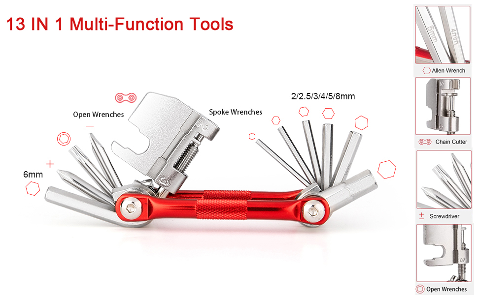 【13-in-1 Bike Multi-Tool】: The Bike Multitool is a very smart piece of equipment which can even fit in your pocket and weighs far less than 1lb. it manages to pack in 13 tool functions: wrenches, screwdrivers, chain breaker and spoke wrenches.