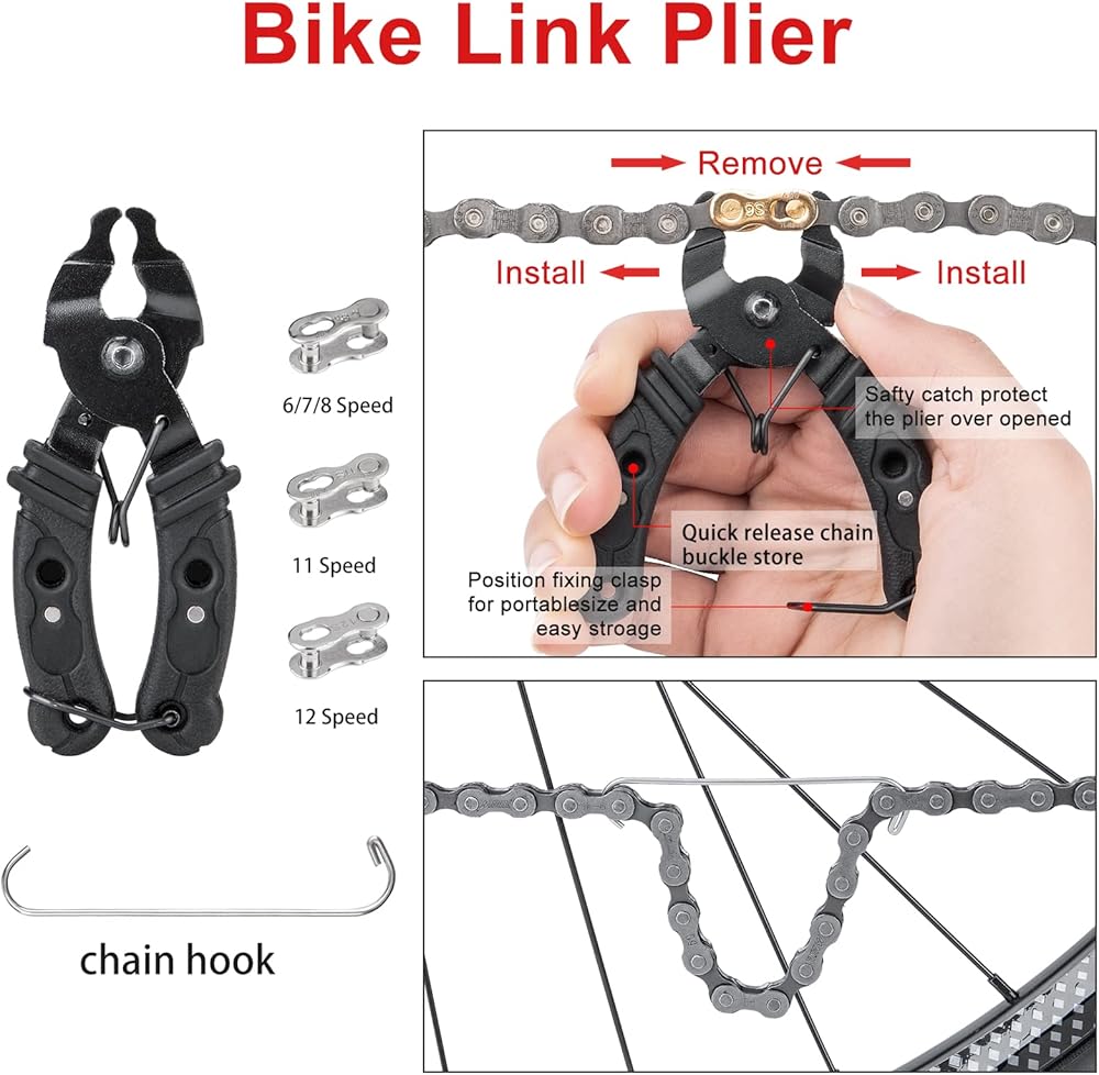 【Bicycle Chain Tool】: OPEN & CLOSE 2 IN 1 Link Pliers are designed to help remove and replace master links in modern chain systems. Over time, dirt and corrosion, it is impossible to separate the joining link by hand. with this Link Plier, easy to pull the chain link into its closed position or open the master link. Compatible with 9, 10, 11, 12 Speed. 3 Pairs Bicycle Missing Link included(6/7/8 Speed, 11 Speed, 12 Speed)