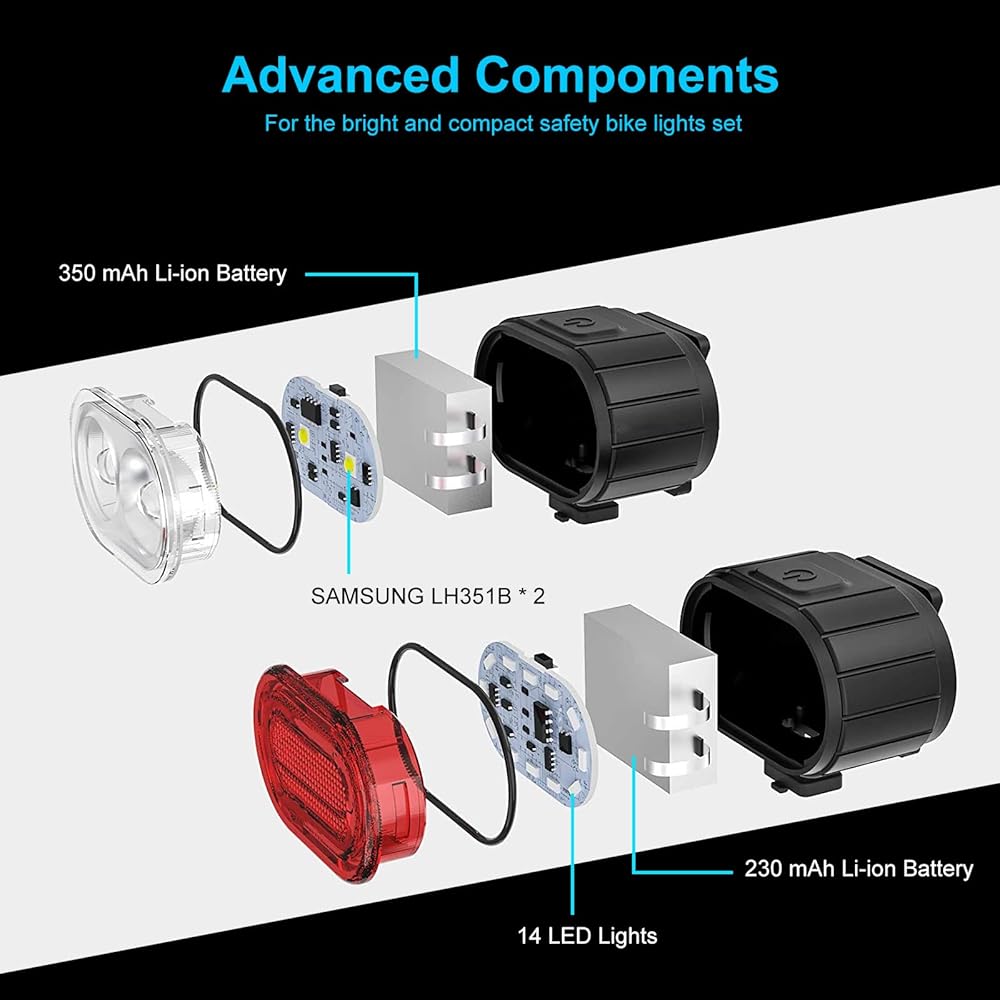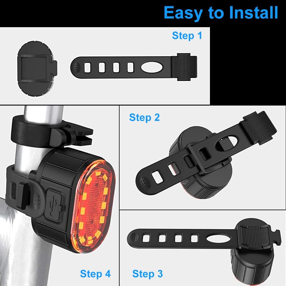 【Multiple Modes】The bike light cluster has a one-touch switch, and the headlights offer four different lighting modes and the taillights offer a choice of six modes. The bike light also has a memory mode.