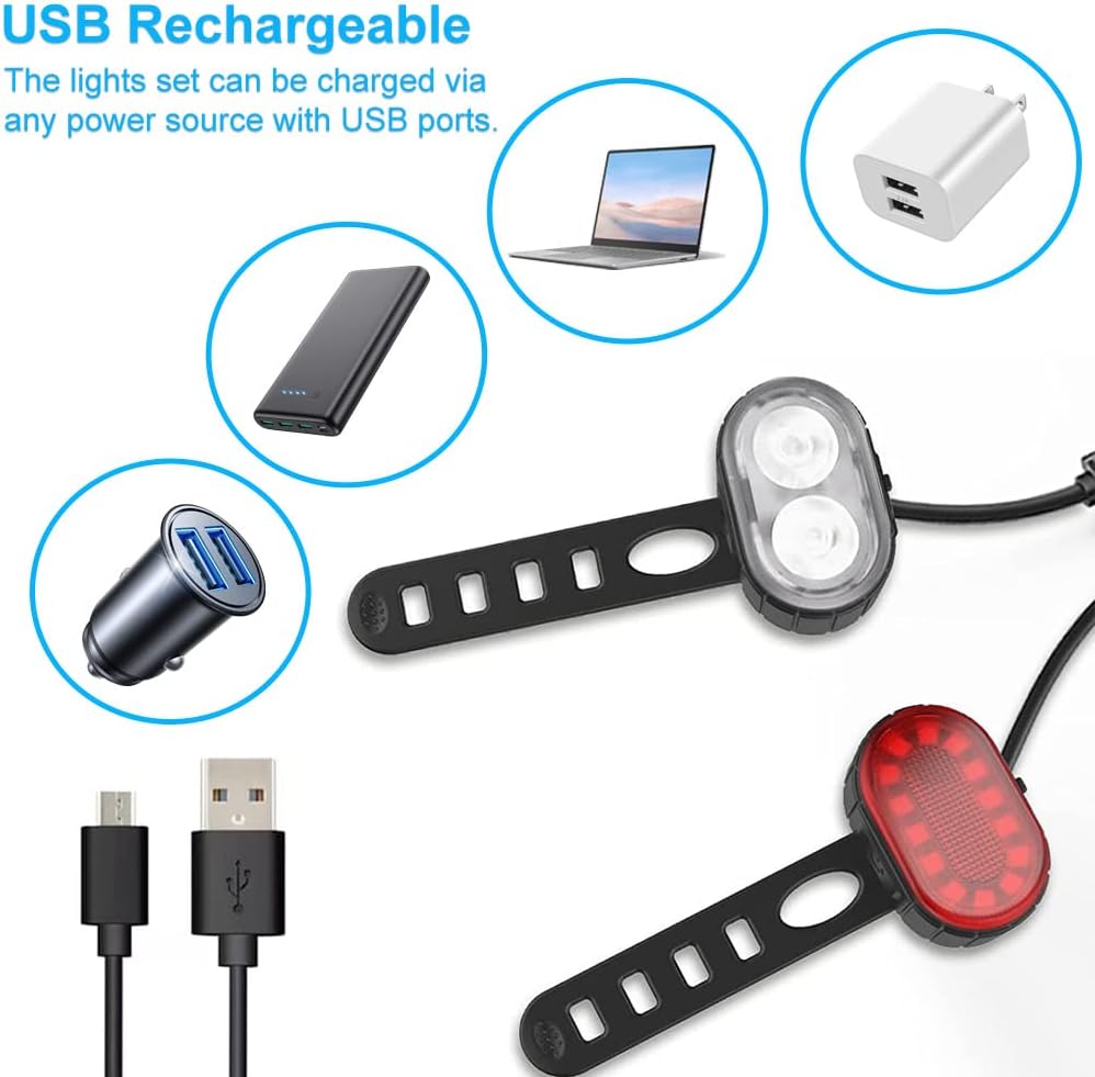 【High Efficiency Recharging】The bicycle lights front and rear built in rechargeable lithium battery. Only one hour to fully charge. Bike light with low battery alert. The rechargeable bike light can be used for 10 hours(bike headlight)or 12 hours(back light) in low light.