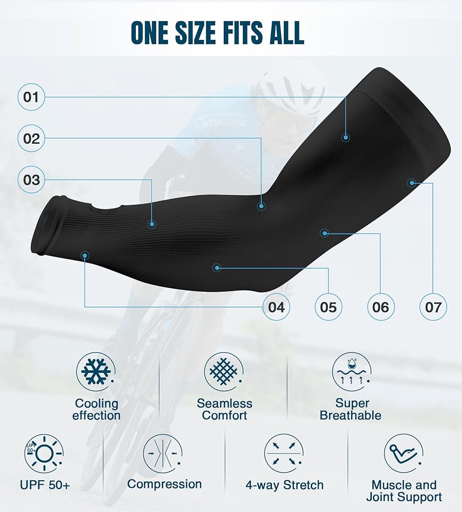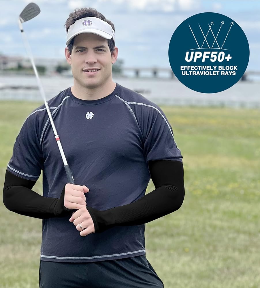 All-Round Sun Protection - UPF 50+ protective technology works great to keep the harmful sun rays off your skin when golfing, shooting, running, bike riding, etc. No need for greasy sunscreen or long sleeves shirts. These uv sun protection arm sleeves shield your arms from sunburn and skin damage during long days in sun.