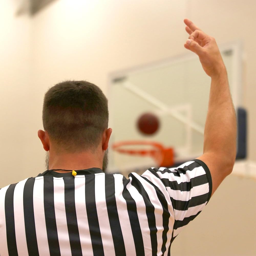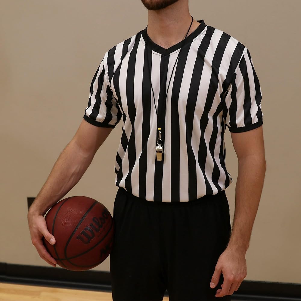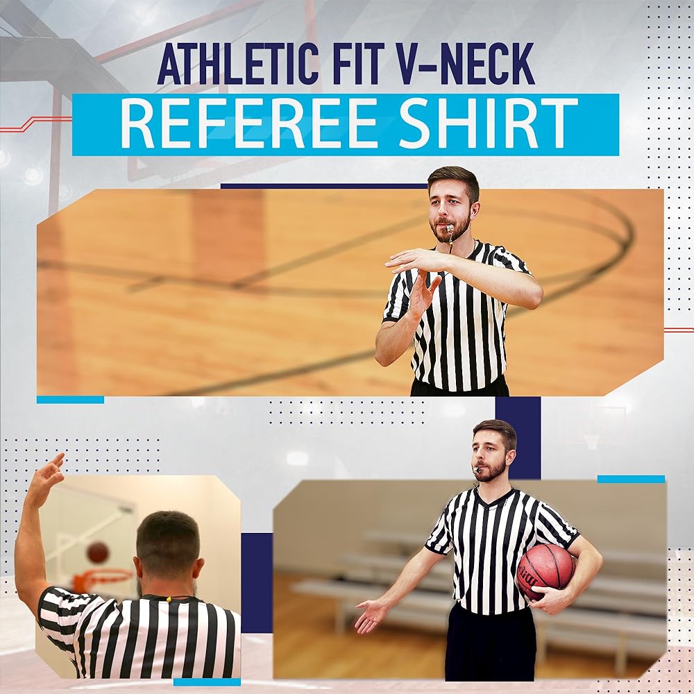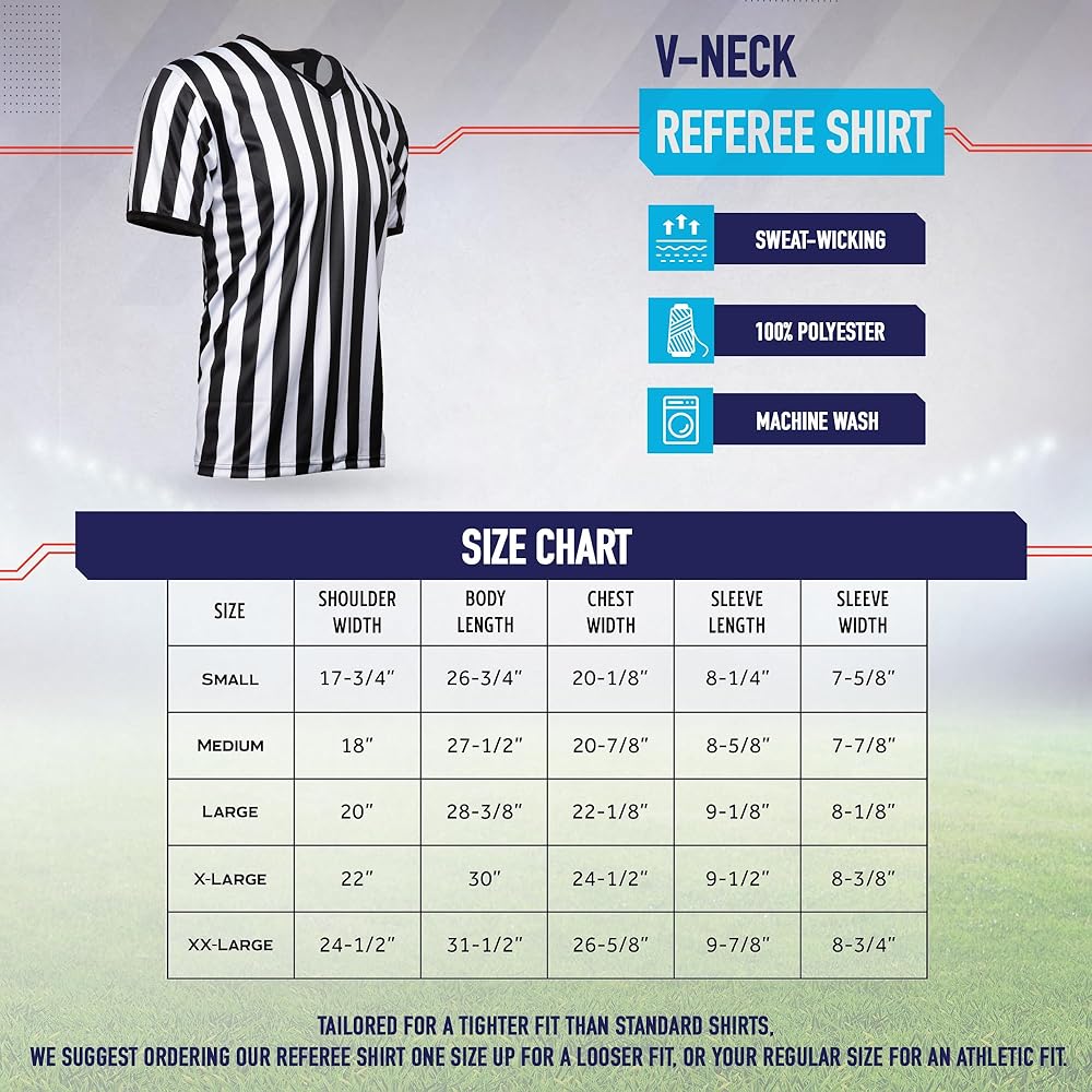 PROFESSIONAL STRIPES: Referee shirts that meet the standard athletic build with 1” black and white stripes with ribbed sleeves and v-neck collar