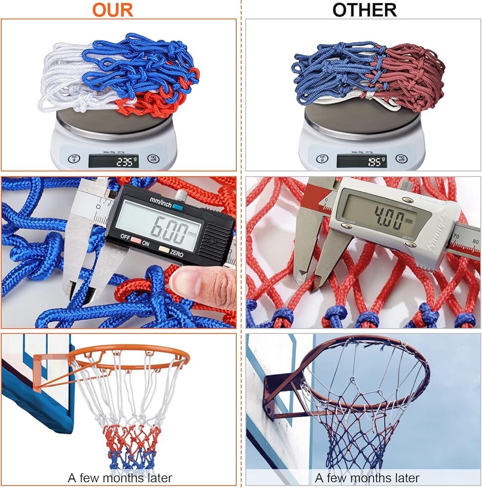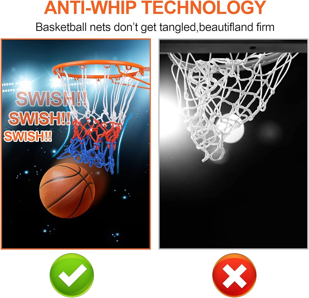 🏀Bright Color And Enjoyable Swish:Smooth rope, bright colors, long time not fade, easier to see the basketball into the frame.The basketball net is flawlessly shaped with the bottom part shrunken to just the right width,makes the swish sound much crisper and clearer.