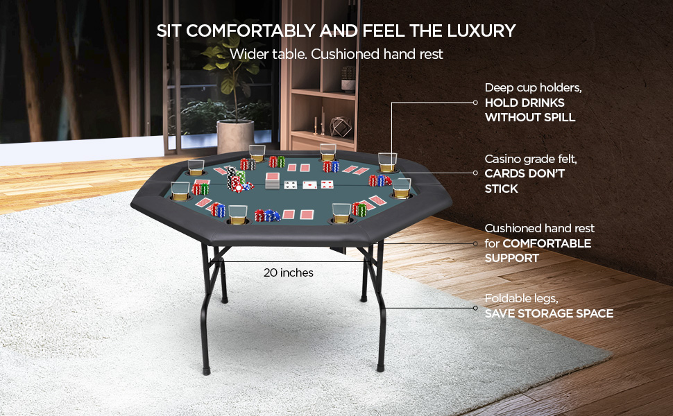 SEATS 8 PLAYER COMFORTABLY WITH MORE SPACE PER PERSON Wider 48 Inch foldable poker table with a 20 inch playing space for each player.