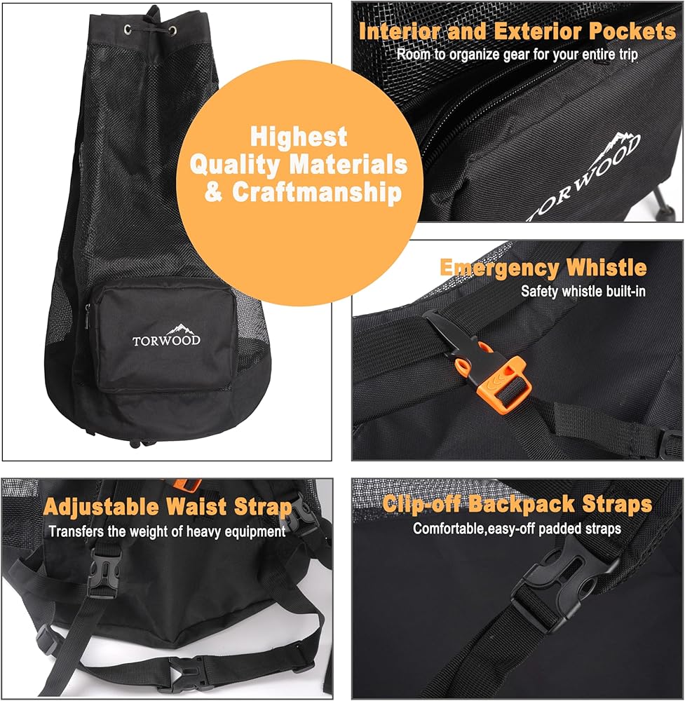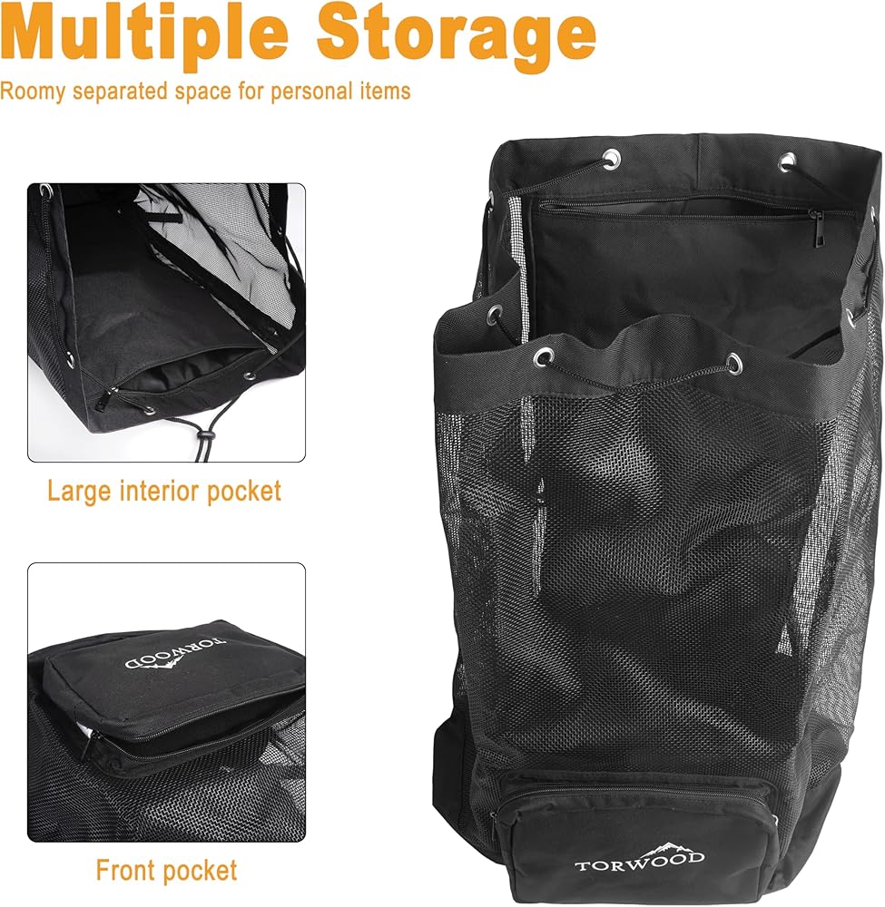 Durable 600D Polyester and PVC Coated mesh to make it robust and functional for traveling and water activities. The mesh design allows water to quickly drain and wet equipment to dry in the open air