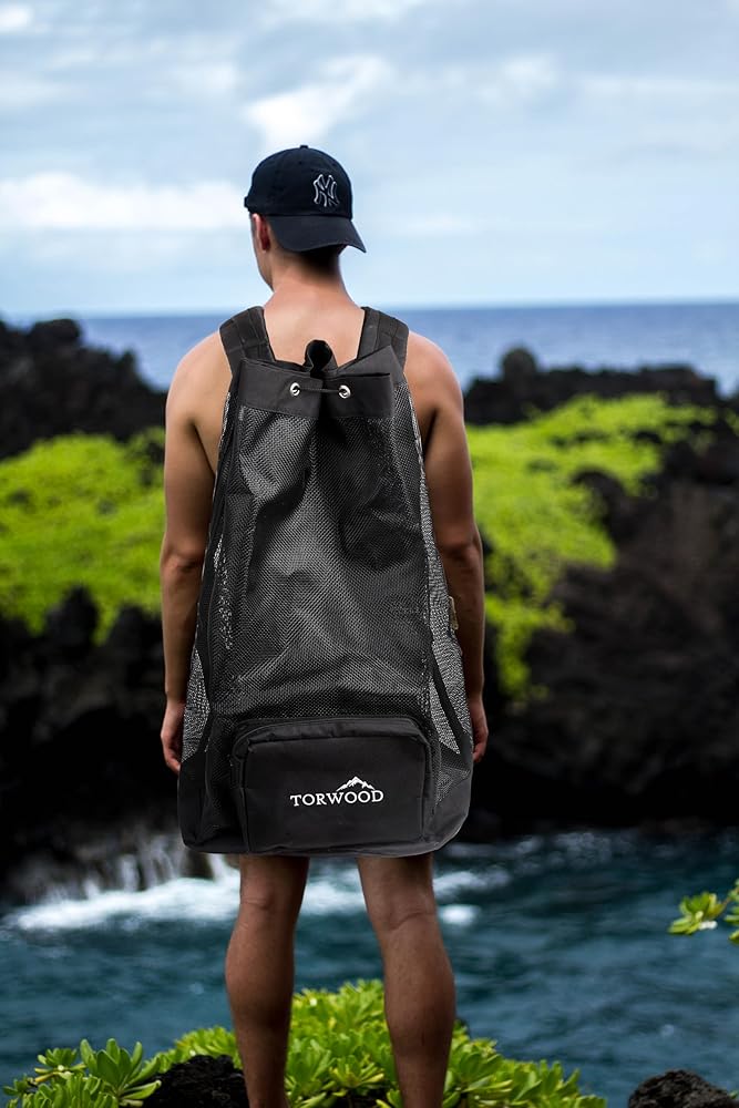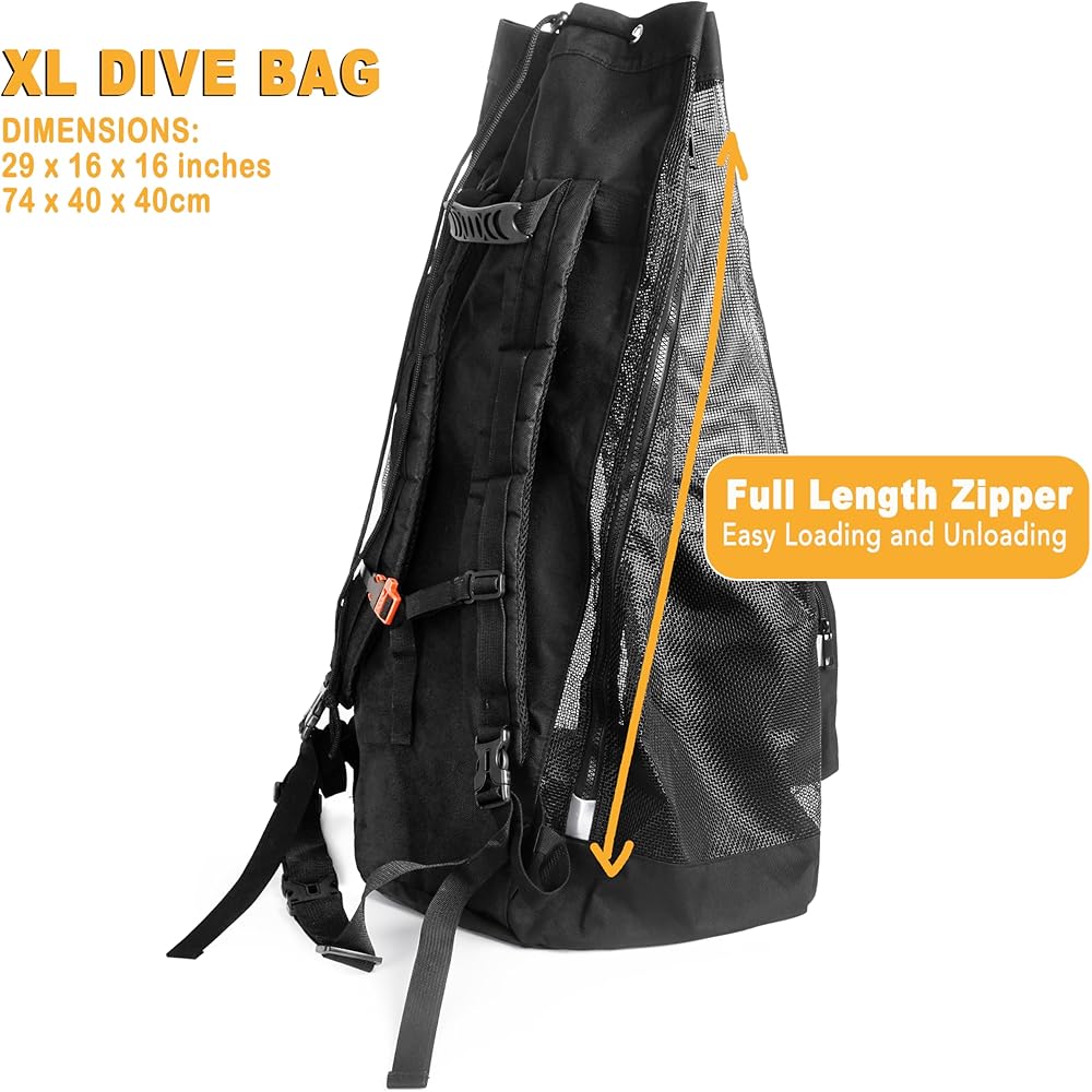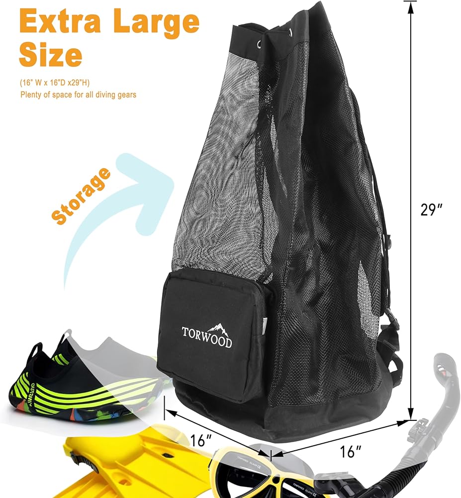 Extra Large size 29" x 16" x 16" (74 cm x 40 cm x 40 cm) and a large zippered outer pocket (10 x 7 x 4") providing ample space to store all for your snorkeling gear, diving, swimming, underwater equipment and more