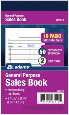Adams Sales Order Books provide a professional 2-part carbonless invoice. Give customers the perforated white top copy. Keep the canary duplicate for yourself. A wraparound back cover tucks between pages so you don't write through multiple sets. Blank space in the header leaves room for a company stamp. Unique 6-digit receipt numbers help you locate orders. 2-Part Carbonless Order Book (white, canary). Bound wraparound cover. 50 Sets per book. Overall size: 4-3/16" x 7-3/16". 3 Pack. Ideal for Small Businesses: Adams Sales Order Books allow you to give customers a professional record of their purchase. Keep the Details: Flexible format provides plenty of room to detail 15 sales items. Personalize It: Use the blank space up top to customize your orders. A company stamp or label works for a fraction of the cost of custom printing. Wraparound Divider: The back cover folds beneath your pages so you don't write through sets. Make Every Sale Unique: Give customers a numbered receipt to make it easy to find your duplicate. A large 6-digit number stands out on the page.