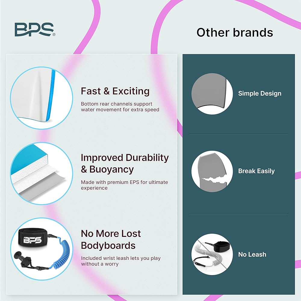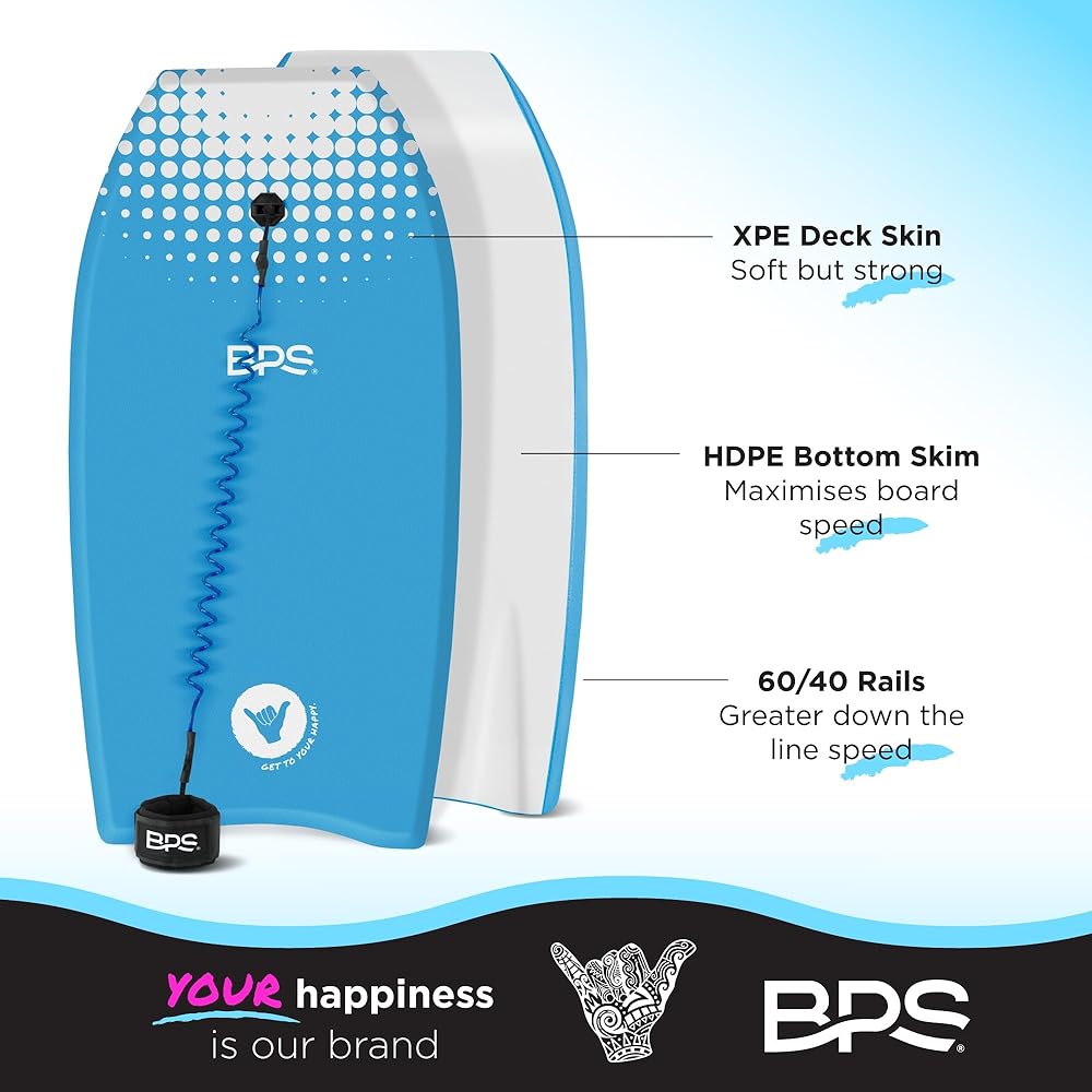 EXPECT HAPPY FACES AND LIFELONG MEMORIES 🤗 Designed for Performance the BPS "Shaka" Bodyboard is an Ultra lightweight board with a slick, high-speed bottom surface, an EPS core for improved buoyancy, bottom rear channels, and a crescent tail. You will experience perfect balance, manoeuvrability, and speed in all wave conditions, and of course our size chart makes sure you can select the perfect board for every rider.