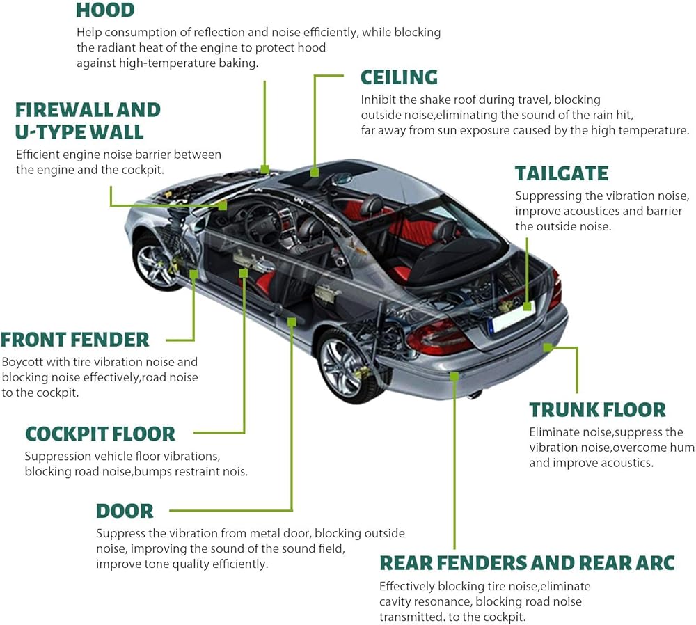 【Fits】You can also use on car roof floors, hood , firewall, chassis, trunk room, trunk lid and so on.. Do not cover the chassis wiring or air holes.