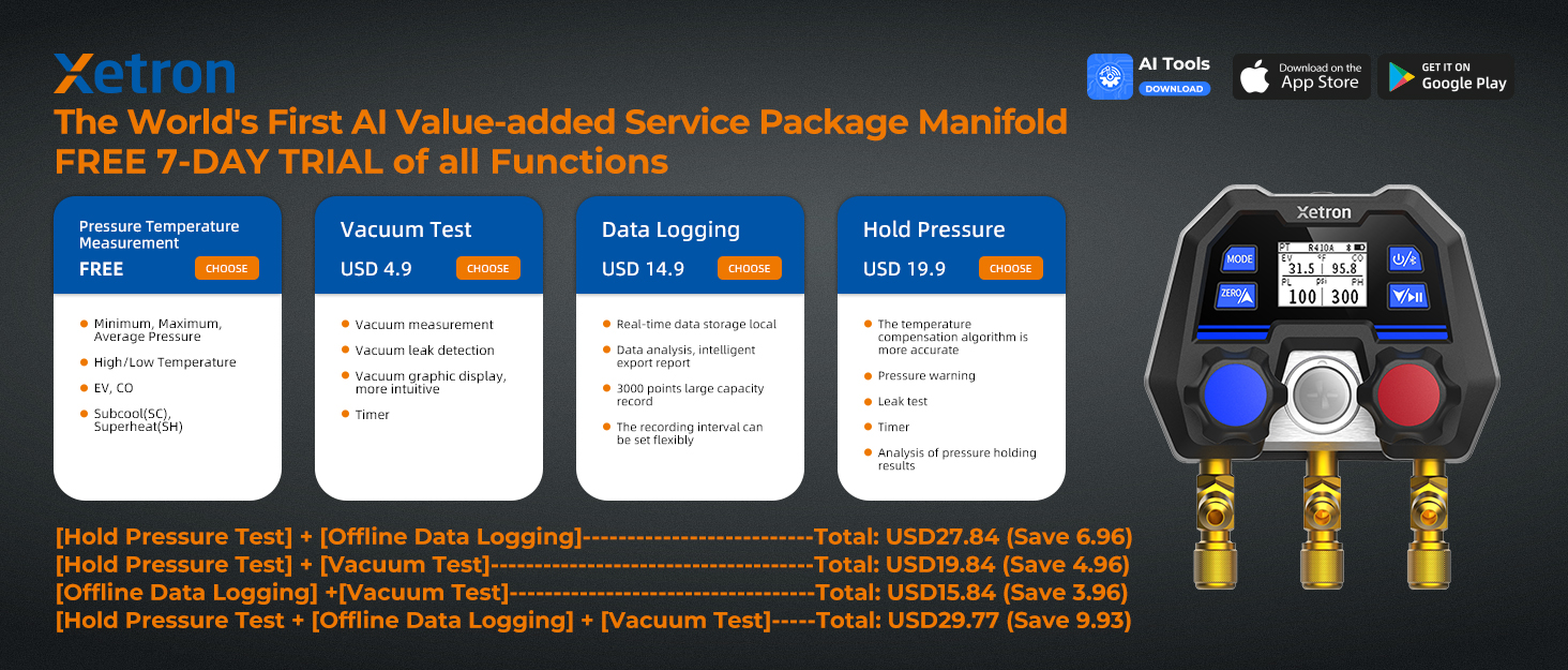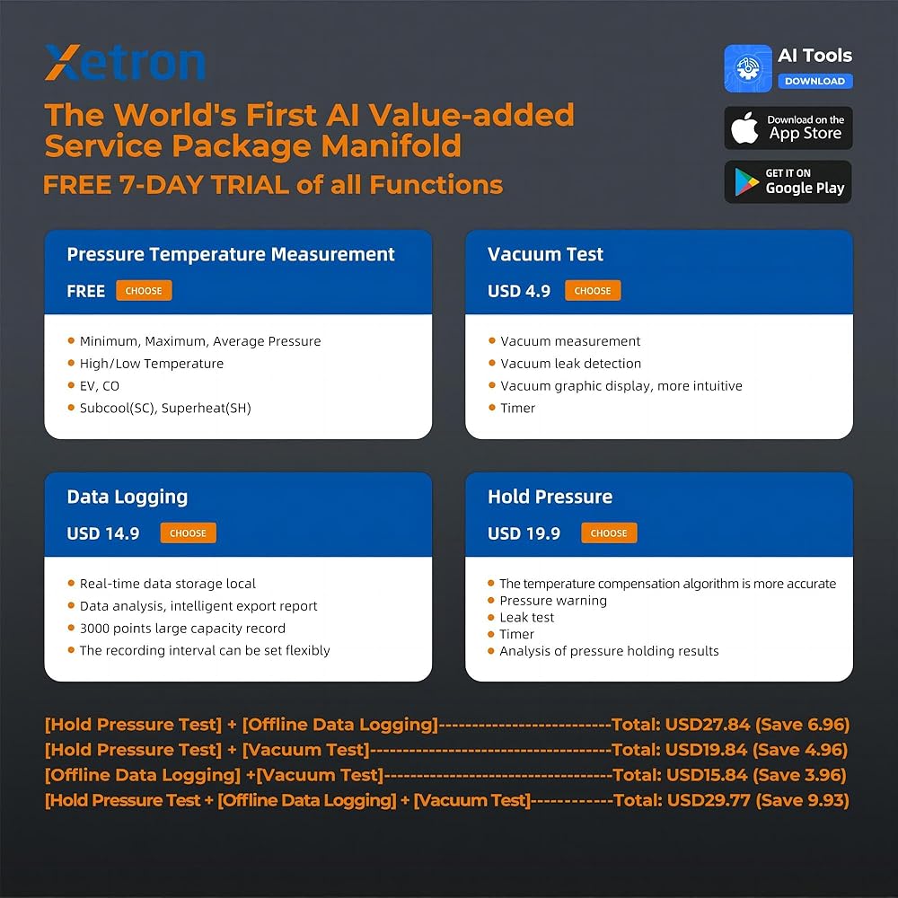 【APP Real-time Data View+ Intelligent Analysis】[Pressure Temperature Measurement Mode] is free, according to your actual working needs, set upper and lower limit of High/Low pressure alarm. You can see these data on APP homepage: Minimum, Maximum, Average Pressure, EV, CO. 【Enter High/Low Temp. auto calculating Subcool(SC) and Superheat(SH)】. 【FREE 7-DAY TRIAL of all Functions: Hold Pressure Test, Offline Data Logging, Vacuum Test】More details and discount bundle please see the picture.