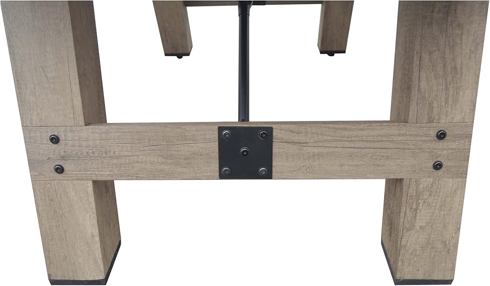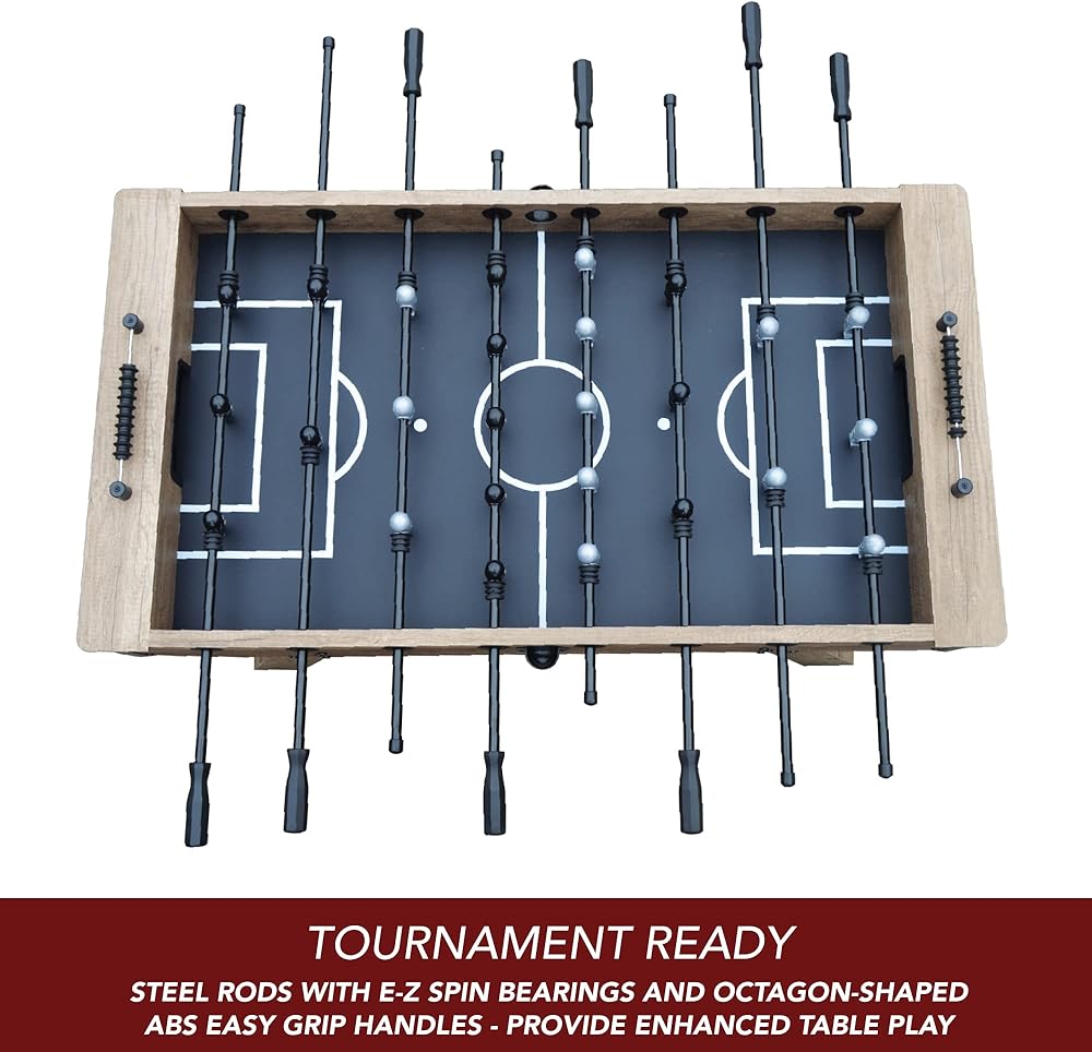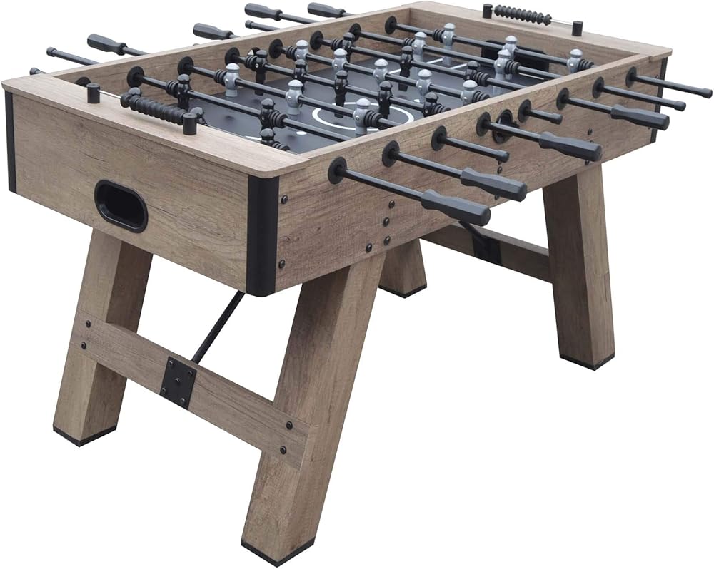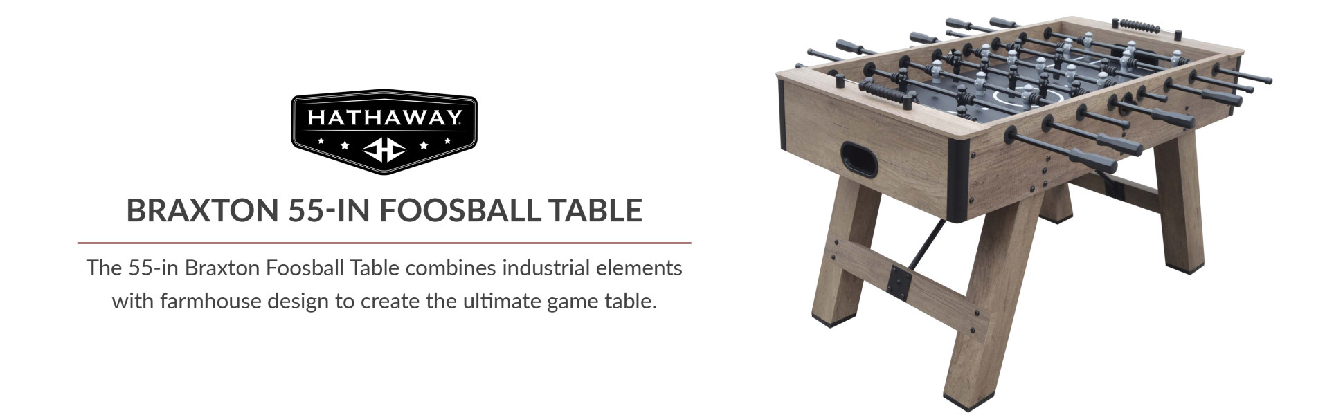 Classic foosball game with a industrial farmhouse design Engineered wood cabinet covered in a barn wood melamine material Durable ABS players with dimpled design for better ball control; 3 goalie configuration 5/8-in black, steel rods with E-Z spin bearings for better durability and performance Octagon-shaped ABS easy grip handles - provide enhanced table play Dual manual slide score counters - effortless score keeping Post leg support base featuring hidden leg levelers and decorative steel accents Table dimensions: 55-in L x 28.75-in W x 34.5-in H 180-day warranty