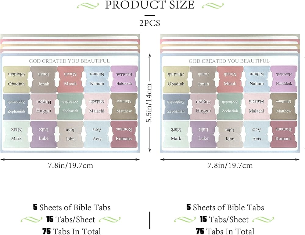 Make your bible study more organised and inspiring with bible tabs! Enhance your bible study with quick navigation. There are 39 tabs for the old testament, 27 tabs for the new testament, and 9 blank tabs on 5 sheets of paper. Enhance your study and find where you need to be quickly.