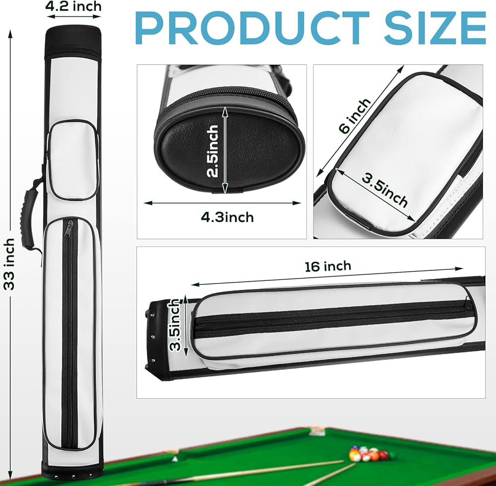 Proper Size to Use: the 2 cue case measures about 33 x 4.2 x 2.5 inches, with a small pocket of about 6 x 3.5 x 1.8 inches, and a large pocket of about 16 x 3.5 x 1.8 inches; The appropriate size makes it easy and convenient for you to store billiard cues