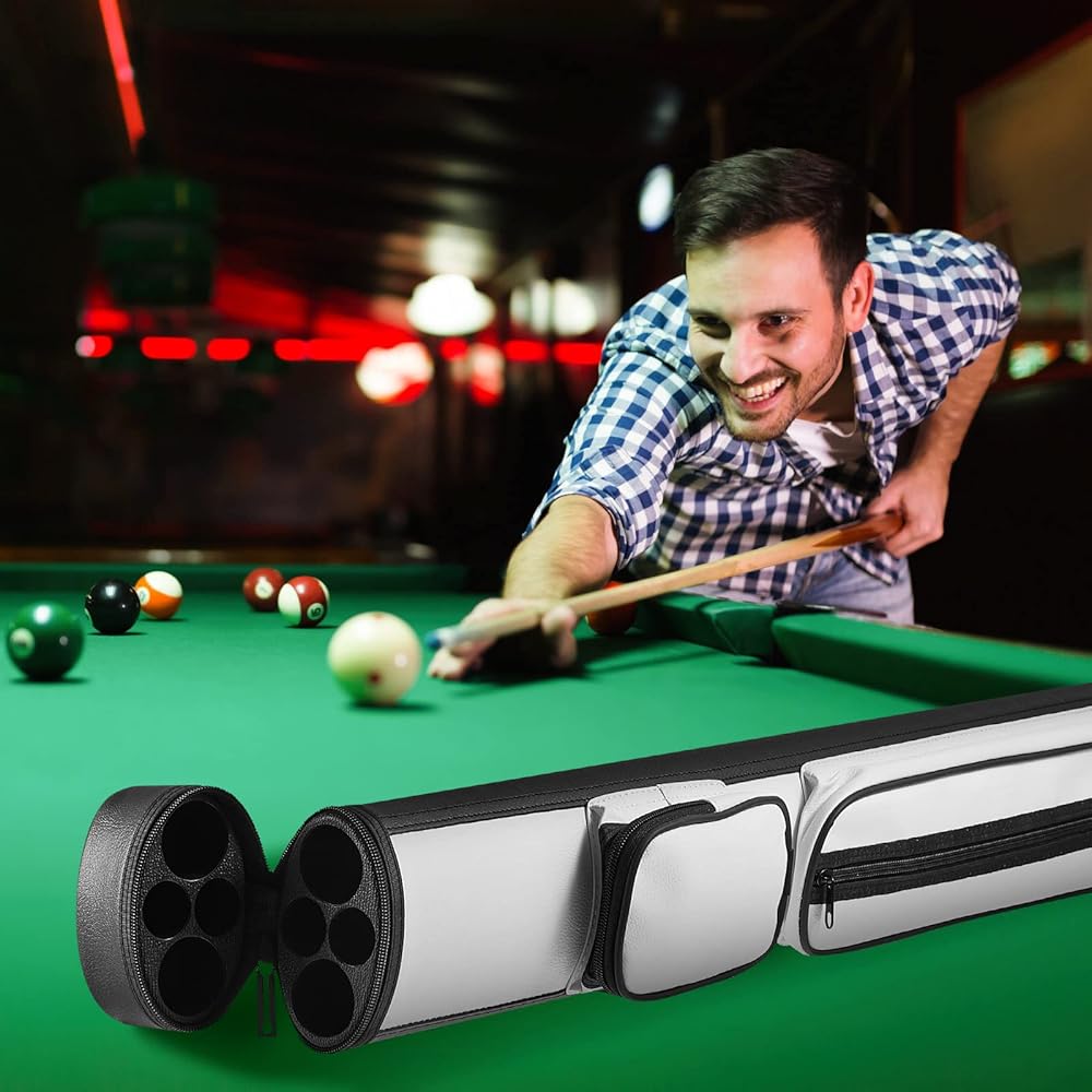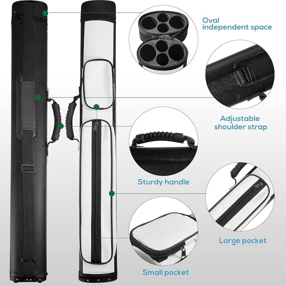 What You'll Get: there are 1 piece of cue stick case, and 2 pieces of pool chalks in the package, which are a thoughtful combination for you to use and replace; The cue case can hold 2 butts and 2 shafts, fits 2 pieces of cues measuring 58 inches or less
