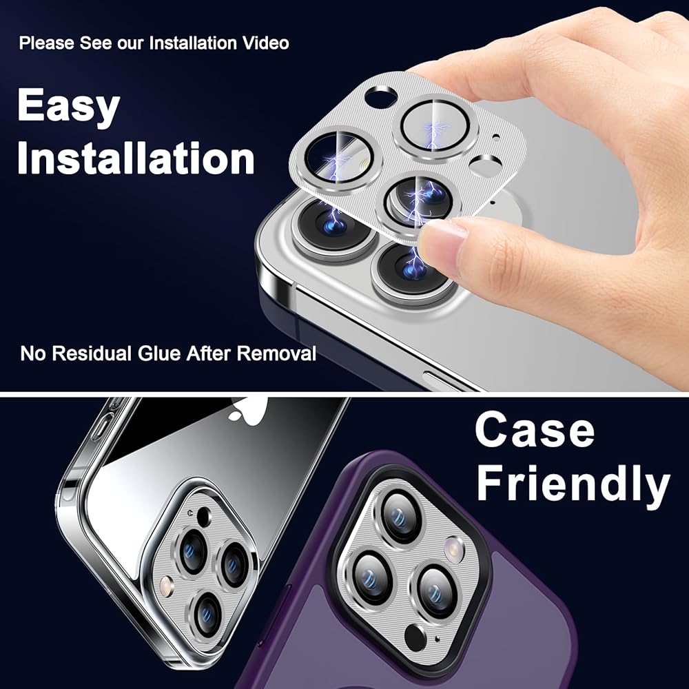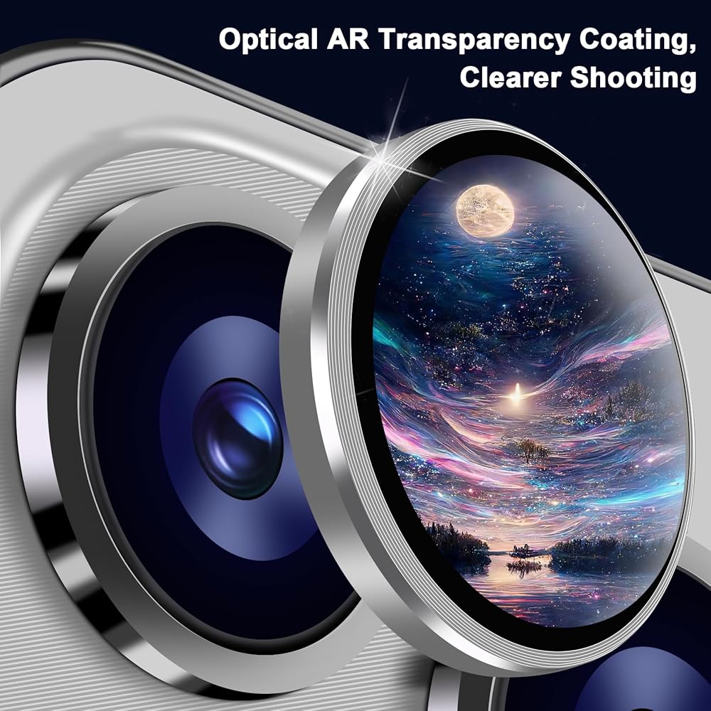 [Shockproof, Scratch-resistant, and Dirt-proof]: The camera protector is made of top-grade aerospace-grade zinc alloy and electroplated sapphire glass, thin and durable. full-coverage edge design will 360 degrees prevent scratches or damages to the lens. The 2.5D rounded corner design provides a smooth touch and prevents any scratches. The nano dual-layer circular seal is waterproof, dustproof, and fingerprint-proof, preventing the lens from fogging even in humid environments.