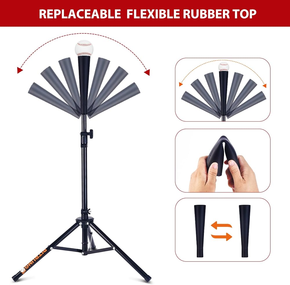 ⚾🥎【2 Ultra- Flexible Rubber Tops】Our baseball/softball batting tee comes with 2 hand rolled Ultra- Flexible Rubber Tops, they're durable and soft that it will never damage baseball bats on mis-hits, suitable for baseball, softball, plastic ball. The rubber top is replaceable, you can replace the top when one breaks down, save your money and time.