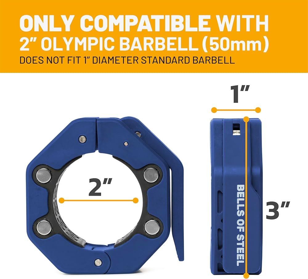 What's in the Package - Your new Bells of Steel Weight Bar Clamps with a rubberized inner layer to protect your bar. 0.2lb each; 1.06in width, 3in outer diameter.