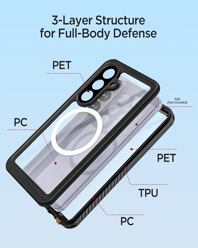 【Military Drop Proof】Our Galaxy S24 Plus case heavy duty is certified to meet Military Grade Drop Test standards, surviving drops up to 14FT heights. Made of double layer shock-absorbing materials, this Samsung S24 Plus waterproof case with 4 anti-collision corners can effectively disperse impact force generated by shocks, bumps, scratches or any other daily damages.