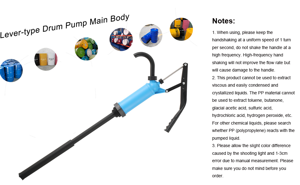 APPLICATION: Polypropylene Lever Action Pump, Ideal for Pumping Oils(gasoline, deisel, kerosene), Water, Alcohol, Weak Acid and Alkali Liquids etc.