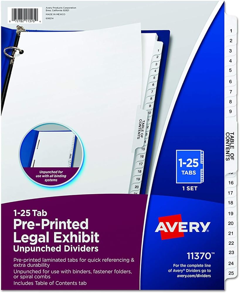 Product Description Guilty of disorderly files? It's time to crack down on chaos. This Premium Collated Legal Divider Set features Tabs 1-25 and a Table of Contents tab, so you can organize index briefs, legal exhibits, mortgage documentation files and more. The white paper stock features Rip Proof reinforced tabs, and tabs are preprinted on both sides using Helvetica bold type, so you can easily access the documents you need. Indexes can fit any binding system because the binding edge is unpunched. It's easy to bring order to your own files. Go ahead, throw the book at disorganization. From the Manufacturer Use for index briefs, legal briefs, mortgage documentation files, and more. White paper stock dividers feature clear, RipProof, reinforced side tabs. Tabs are printed on both sides with Avery Style Helvetica Bold typestyle. Binding edge is unpunched so indexes can fit any binding system. Design conforms to all state and federal requirements. Index dividers include a Table of Contents tab.