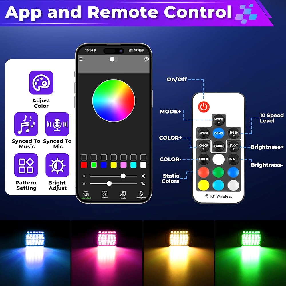 RF & APP CONTROL - Control your LED rock lights using the wireless 21-key RF remote or our dedicated Bluetooth app compatible with iOS 7 and Android 4.3 and above. Experience freedom in customizing colors, patterns, and syncing lights with music with our RGB rock lights, thus transforming your vehicle into a mobile party.