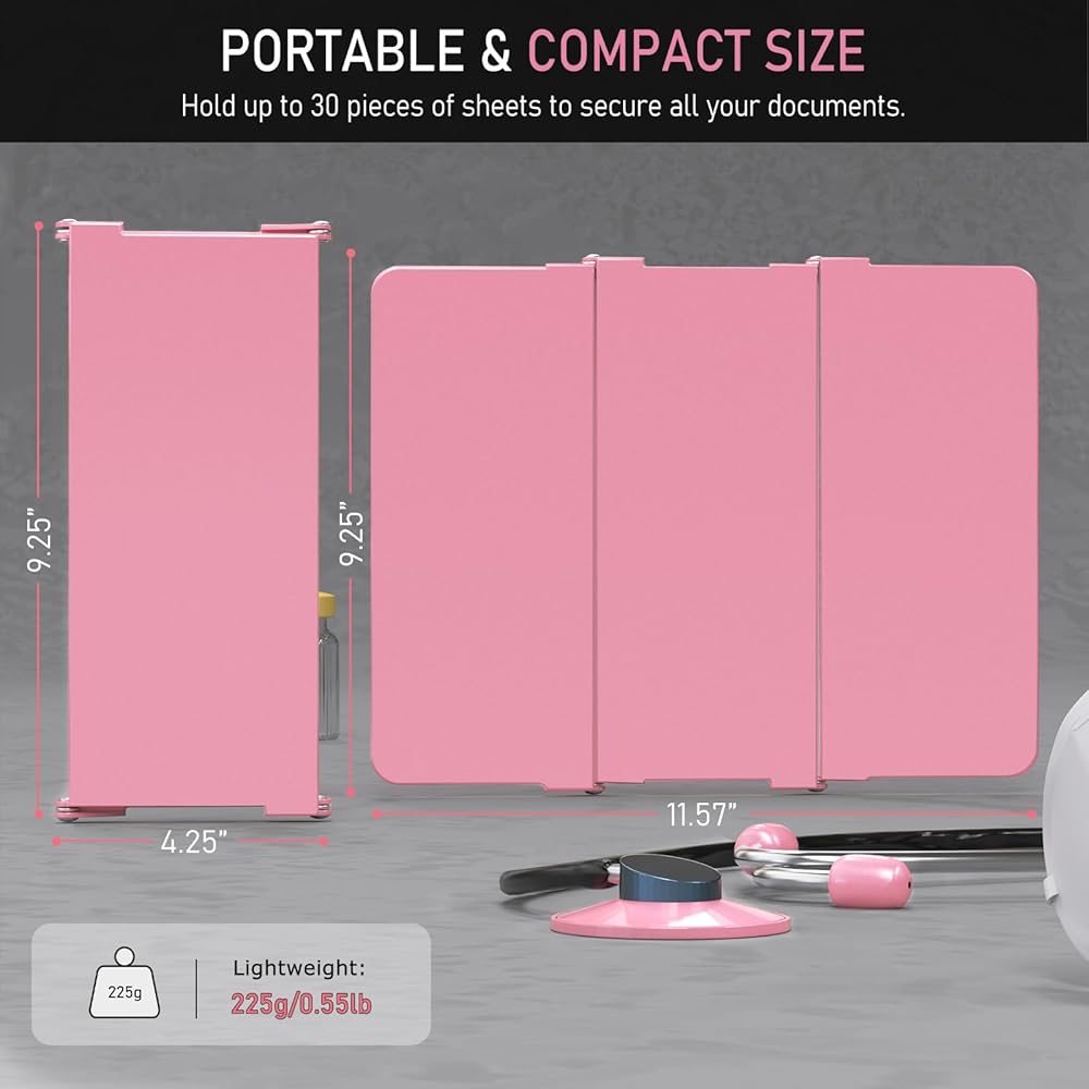【Foldable & Compact Size.】With the 3 layers folding design, this lightweight and compact nurse clipboard is foldable and easy to carry on your pocket, handbags and backpacks. The full size of this foldable nursing clipboard is 9.3" x 11.6" and its folding size is 4.3" x 9.3". And its low-profile metal clip and pen holder provides strong grips for your documents.
