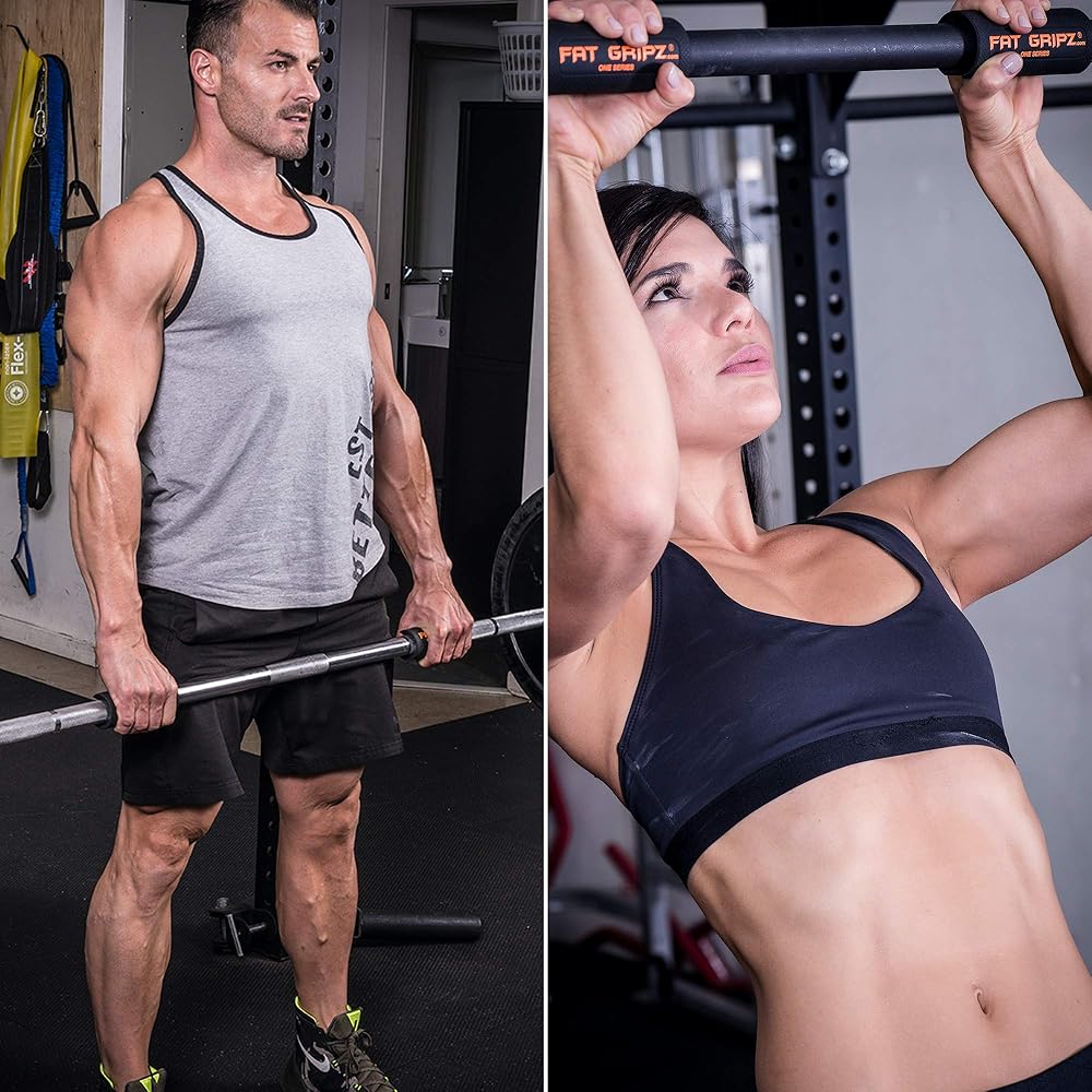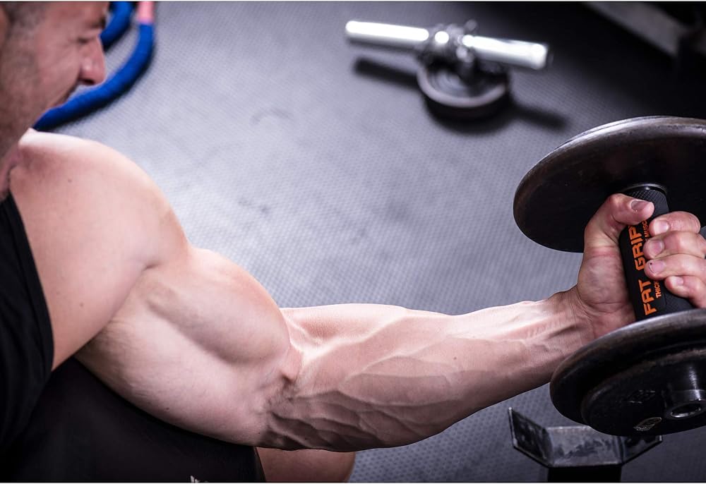 Using fat grips / fat bar grips / thick bar grips / dumbbell grips / barbell grips / an axle bar adapter is one of the most effective ways to build maximum muscularity and strength, especially bigger arms, big biceps and big forearms. Fat Gripz are a must-have item of arm workout equipment / weight lifting equipment / strength training equipment and the number one item in the categories of gym accessories for men and grip strength trainers. They are great for dumbbell bicep workouts, forearm workouts, grip strength and biceps workouts at home