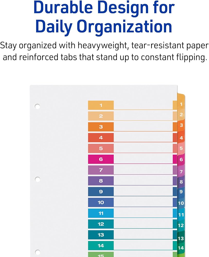 Organize your projects in seconds with Avery Ready Index 15 tab dividers. Each tab is uniquely color coded and preprinted to present a professional look. Print customized section titles and images onto the table of contents sheet without worrying about inserts or labels. Whether you're hosting a meeting or creating binders for classes, these binder dividers are perfect for getting things sorted. 6 sets of 15 tabbed dividers are included with each sheet measuring 8-1/2”x11”. The 3 ring binder holes are reinforced on both sides of the heavyweight sheet to prevent tearing. Each divider tab also includes additional reinforcement along the edge of the sheet to distribute stress and resist creasing. The table of contents sheet is also compatible with both laser and inkjet printers. This sheet can be printed in either portrait or landscape so that projects can be organized in any orientation. Just flip the sheet over to view the other layout. Check out the free templates for these dividers and try out the Avery Design & Print software today on the Avery sites