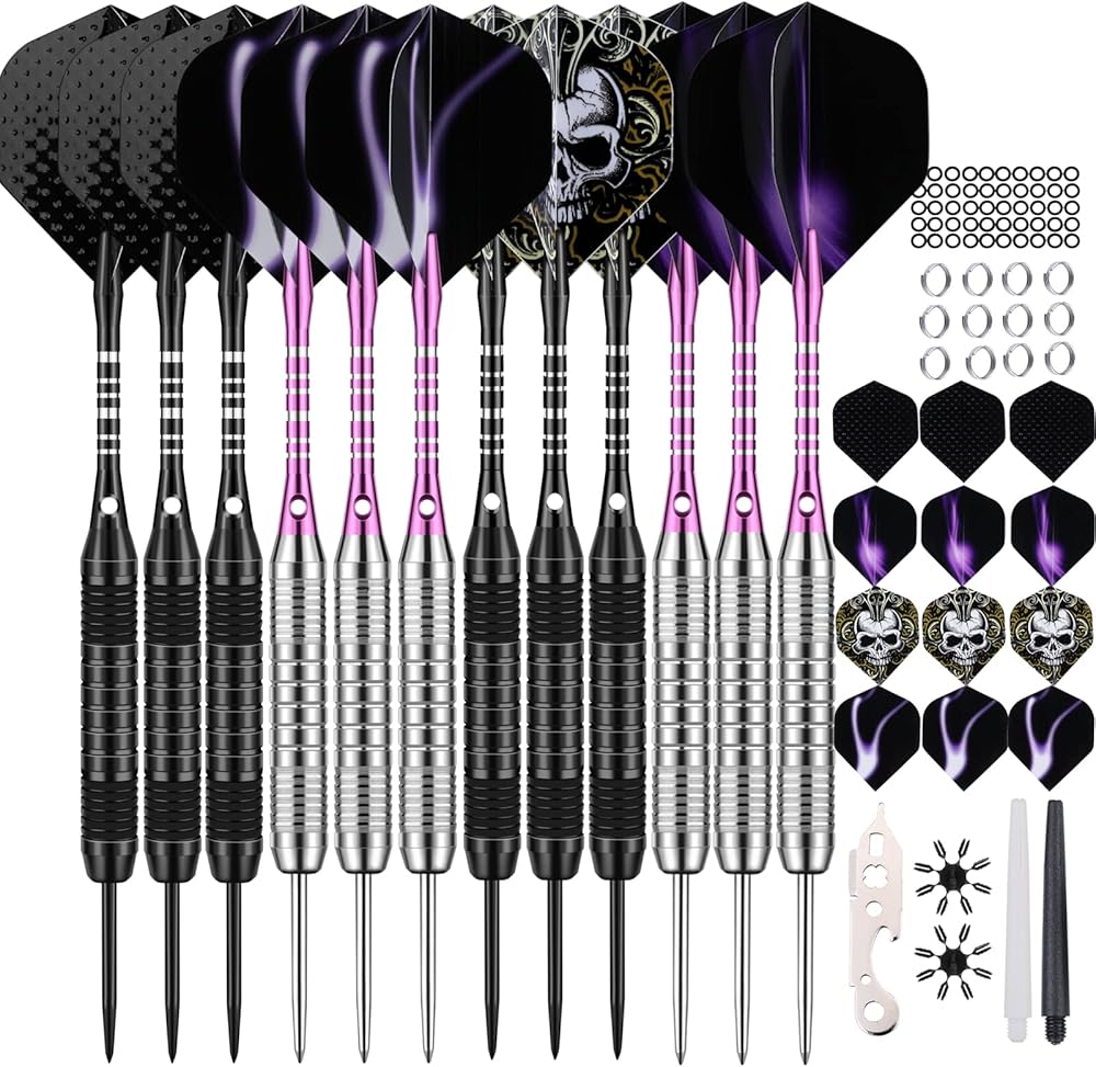 12 Pack Darts Metal Tip Set 22/24 Grams, Steel Tip Darts for Dartboard with Premium Aluminum Shafts, Extra 50 Rubber O-rings 6 Nylon Shafts 24 Flights 12 Spring Rings 16 Flights Protector 1 Tool Kit