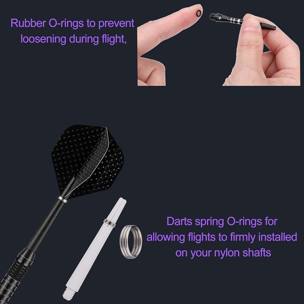 Unbreakable aluminum shafts:Light-weighted slim alu shaft comes with an anti-loosening O ring placed around the standard 2BA thread. It give the dart exceptional balance and greatly reduce the need to retighten during play; Locking holes allow for a tighter fitting that improves stability;