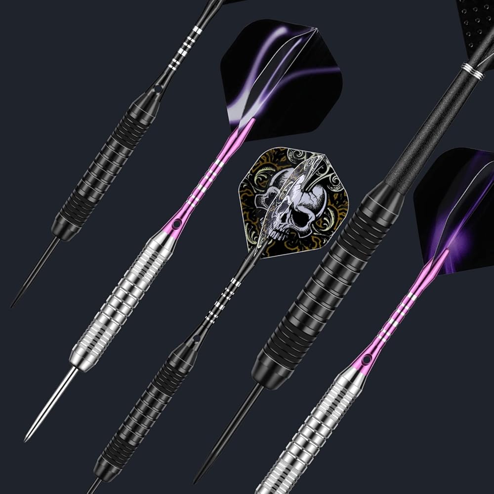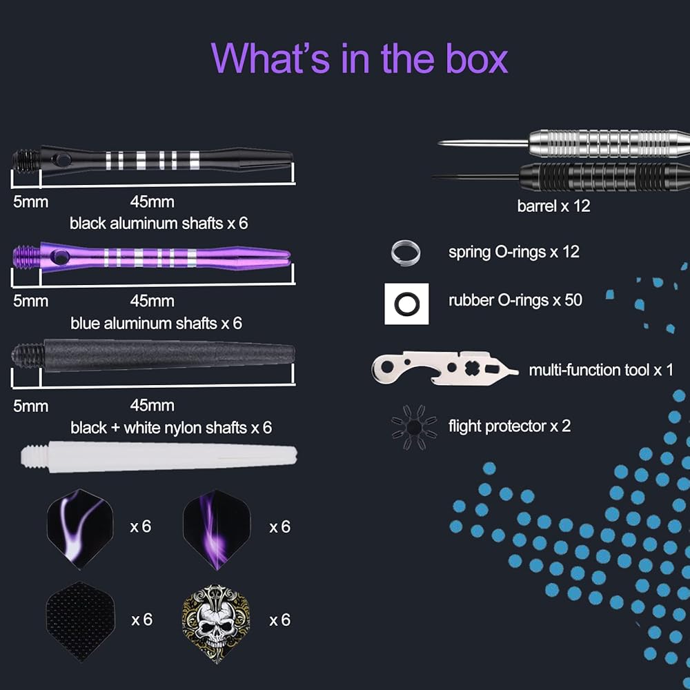 DARTSPACE metal tip darts set: we offers unique and practical steel tip darts set for beginners and professional dart player. The darts steel tip set equipped with 6pcs precise black barrels 22g + 6pcs nickel plated barrels 20g, light weight aluminum shafts, 24pcs dart flights with 16pcs flights protector, 1 dart tool . Extra 50 x rubber O-rings to prevent loosening during flight, 6x high quality black nylon shafts + 12pcs spring O-rings.