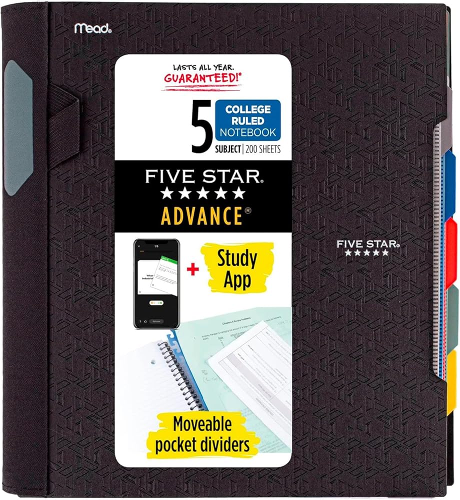 LASTS ALL YEAR. GUARANTEED!* Take your notes to the next level of organization and durability with Five Star Advance. Compatible with the Five Star study app, you can easily scan, study and organize notes on your phone! Create instant digital flashcards and sync notes to Google Drive and access them anywhere from any device. Rearrange the movable plastic dividers anywhere in your notebook to organize notes. Dividers with expanding pockets hold 8-1/2" x 11" handouts. Visible tabs from front cover make it easy to flip to any section. 5 subject notebook has 200 double-sided, college ruled sheets that are perforated so edges stay clean. Sheets measure 8-1/2" x 11" when torn out. Spiral Guard covers the wire to help prevent coil snags on clothes and backpacks. Label your notebook on the writable spine, and keep your favorite pen or pencil handy in the pen loop. Available in Black. *Guarantee is valid for one year from purchase date. Does not cover misuse.
