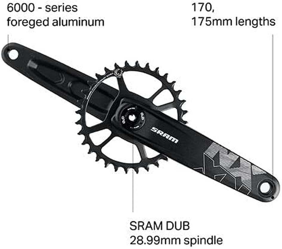 Sram: START WITH EAGLE The SRAM NX crank set delivers Eagle styling and performance to the newest addition to the Eagle ecosystem. Designed for SRAM's X-SYNC2 chain rings, the NX crank set is engineered for complete chain control-each tooth's profile is precisely engineered to work quietly, efficiently and securely with the Eagle chain's inner and outer links. DUB technology features a better-engineered bottom bracket and a new spindle design, which together allows for a more uniform approach to bottom bracket fitment, better sealing against contamination and forward and backward compatibility. Now everyone can benefit from a new measure of performance and durability. THINGS TO REMEMBER Eagle technology provides an expanded, optimum, gear range making you fast on the flats, giving you control on the climbs and unleashing your speed on the descents. Eagle is a complete drivetrain system that was developed to be an integrated high-performance ecosystem. The engineering and testing that went into the development provide for maximum performance, safety, and long-term durability to ensure a great consumer ride experience. We guarantee this performance when Eagle drivetrains are used as a complete ecosystem. For additional information, please contact your SRAM Sales Contact. FEATURES AND BENEFITS 6000 series forged aluminium arms DUB technology features a uniform approach to bottom bracket fitment, better sealing against contamination and is forward and backward compatible. ISO 4210 compliant. See Declaration of Conformity for details. SPECIFICATIONS speeds: 11/12BB Compatibility: BSA68/73/100,PF121,PF89.5,PF92,PF30,BB30Chainring Size: 32Crank arm length: 165mm, 170mm, 175mmChainline: 49.0mmBB Spindle Interface: DUB Chain ring material: Steel Guard: No Guard Bolt Circle Diameter (BCD): Direct Mount (DM)Crank arm material: Aluminium Colour (Crank arm): Black