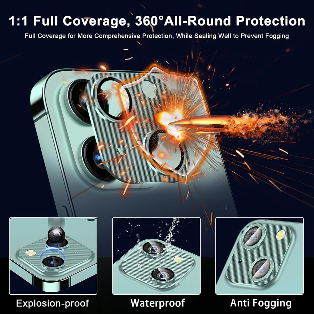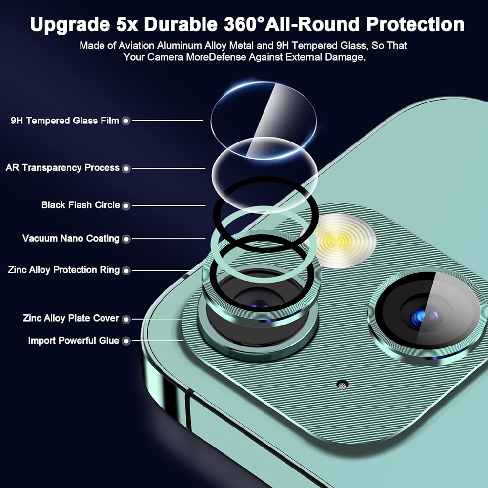 [Shockproof, Scratch-resistant, and Dirt-proof]: The camera protector is made of top-grade aerospace-grade zinc alloy and electroplated sapphire glass, thin and durable. full-coverage edge design will 360 degrees prevent scratches or damages to the lens. The 2.5D rounded corner design provides a smooth touch and prevents any scratches. The nano dual-layer circular seal is waterproof, dustproof, and fingerprint-proof, preventing the lens from fogging even in humid environments.